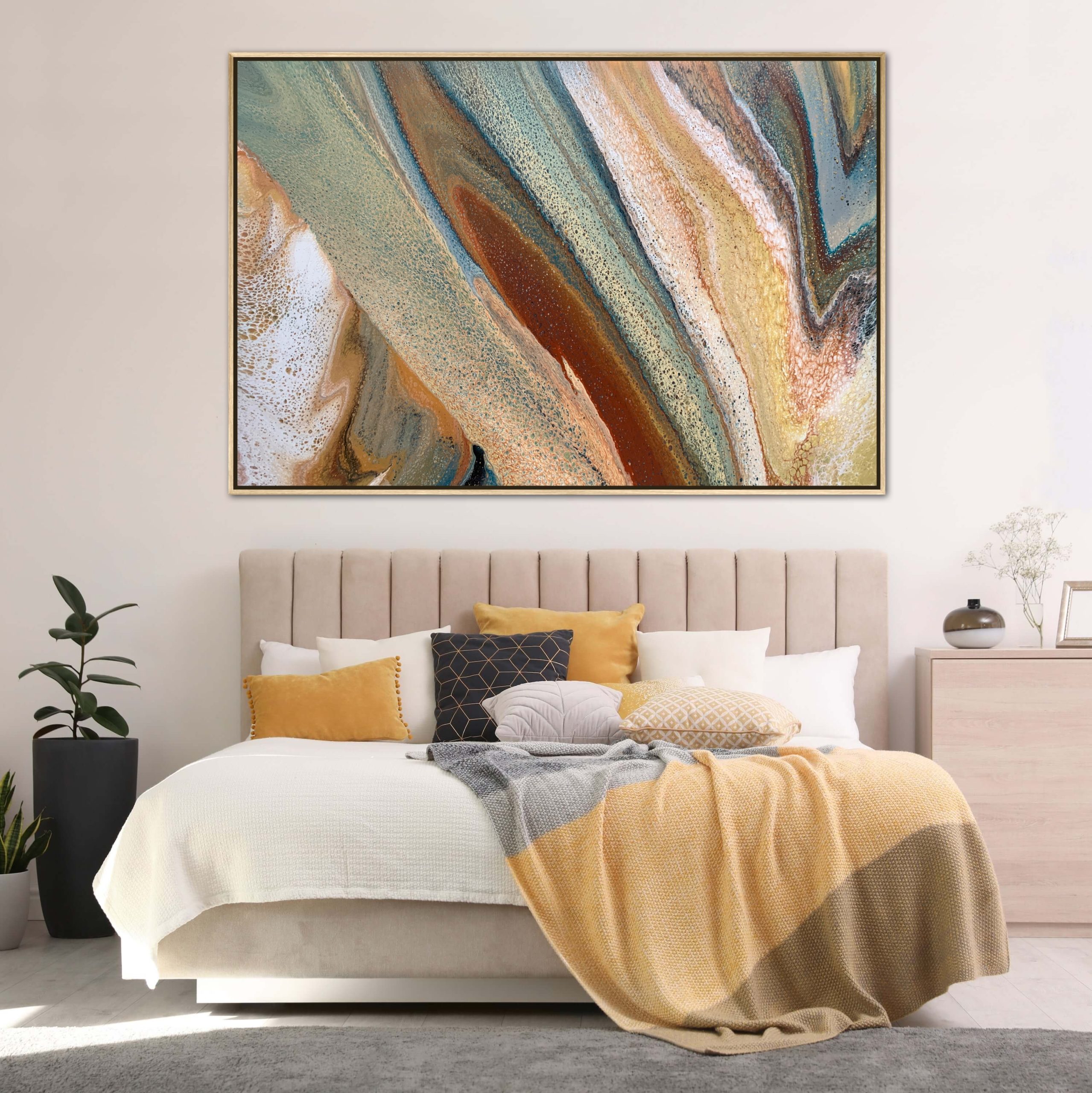 1. Immersed in Nature was created using various techniques combined to allow increased flow, interaction and separation of colours to create interesting patterns where pops of colour can be seen emerging from underneath. This added dimension adds lace and cells to the artwork creating an interesting and one of a kind painting that can never be replicated. A gorgeous variety acrylic pigments were used including metallic gold, bronze, copper, silver, blues & greens, grey, rose gold, warm browns, black and white.