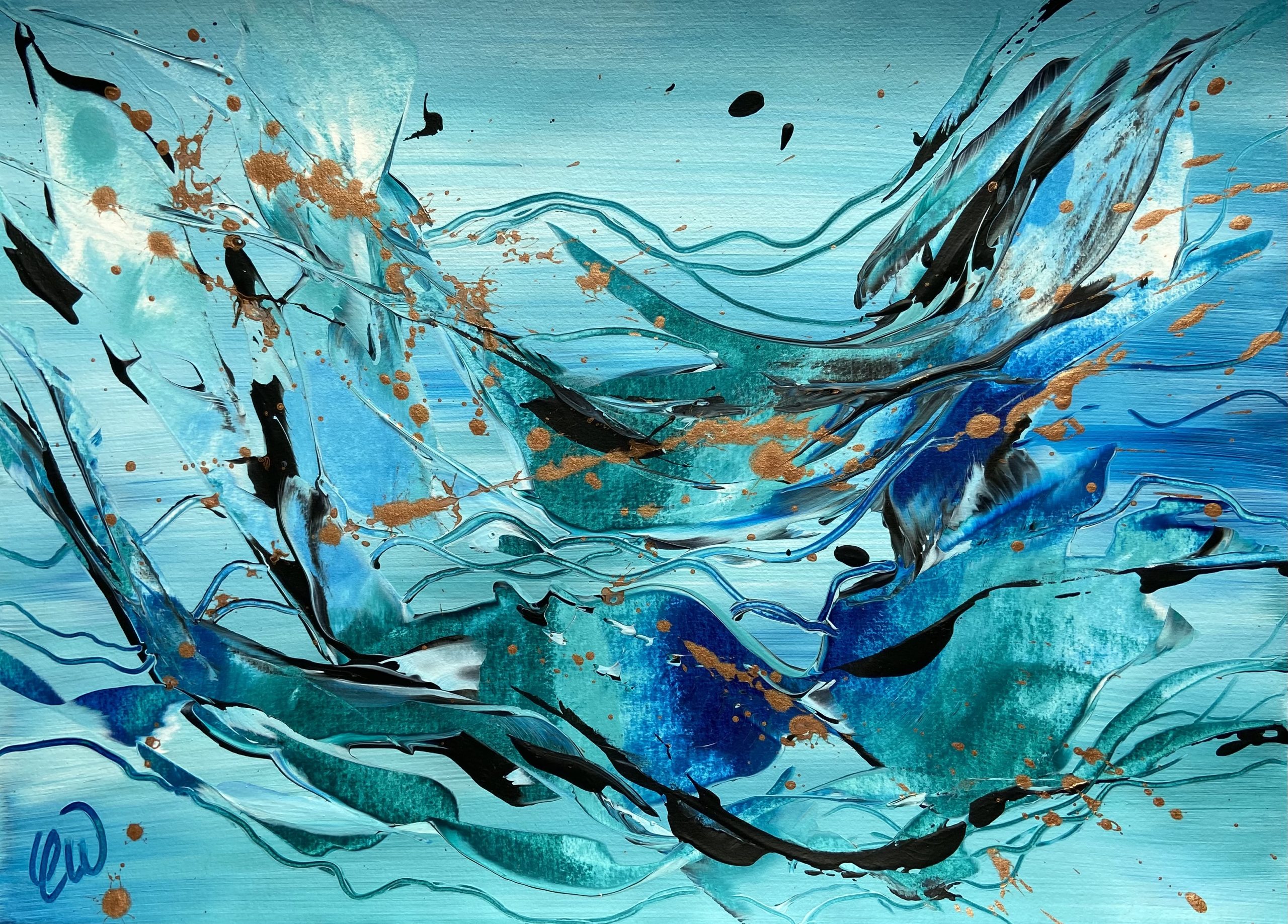 Immersion by Carrie Welsh is a beautiful abstract piece reminiscent of flowing water. This painting has a stunning copper element that shimmers in the light and highlights this artwork. Some images show what this piece looks like framed. Frames not included. 29.7 x 42 cm (A3 size) Acrylic on paper. Requires framing.