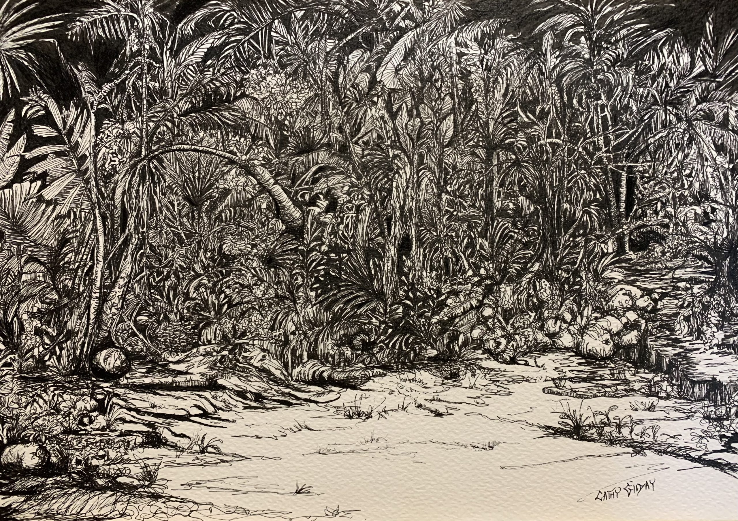 Impenetrable by Cathy Gilday – This intricate ink drawing of a rainforest was inspired by images I had taken, while travelling through Malaysia and Thailand. The tropical climates, are a natural haven for majestic trees, that seem to be enveloped by ferns, climber vines and green moss undergrowths. Requires Framing.
