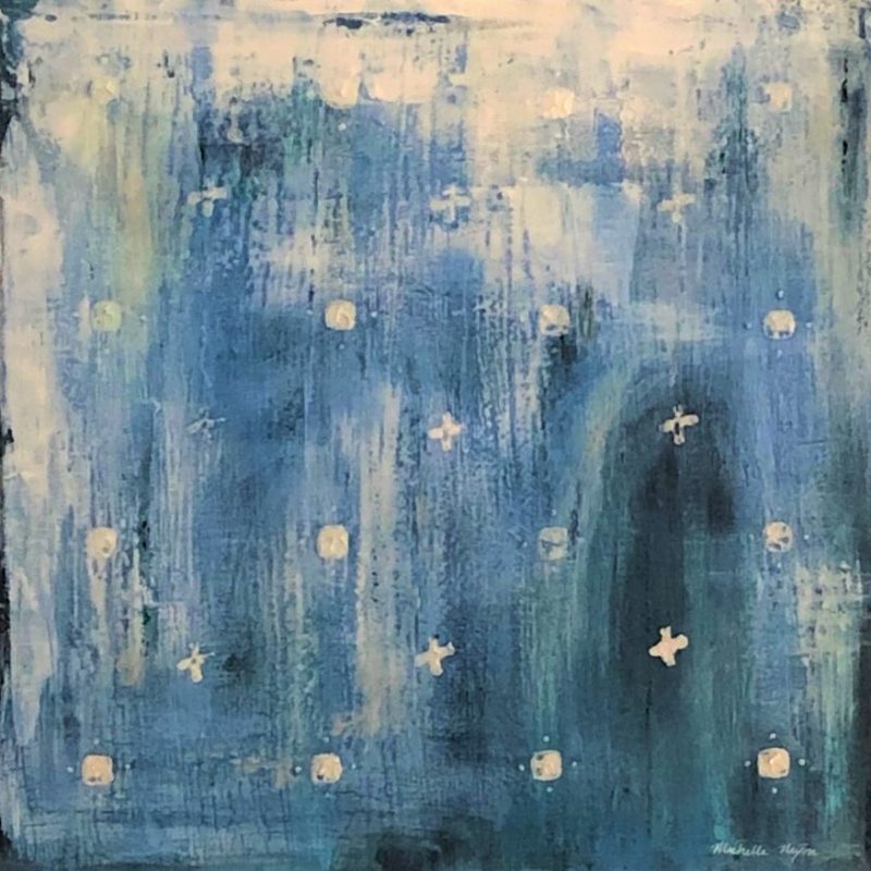 I splashed blues, aqua and white paint (eat your heart out Jackson Pollock LOL) diagonally across the canvas to create a feeling of tempest rain. Next I added an outline of a female head & shoulders with the intention of calling the painting “Tempestas” (Goddess of rain/tempest).
