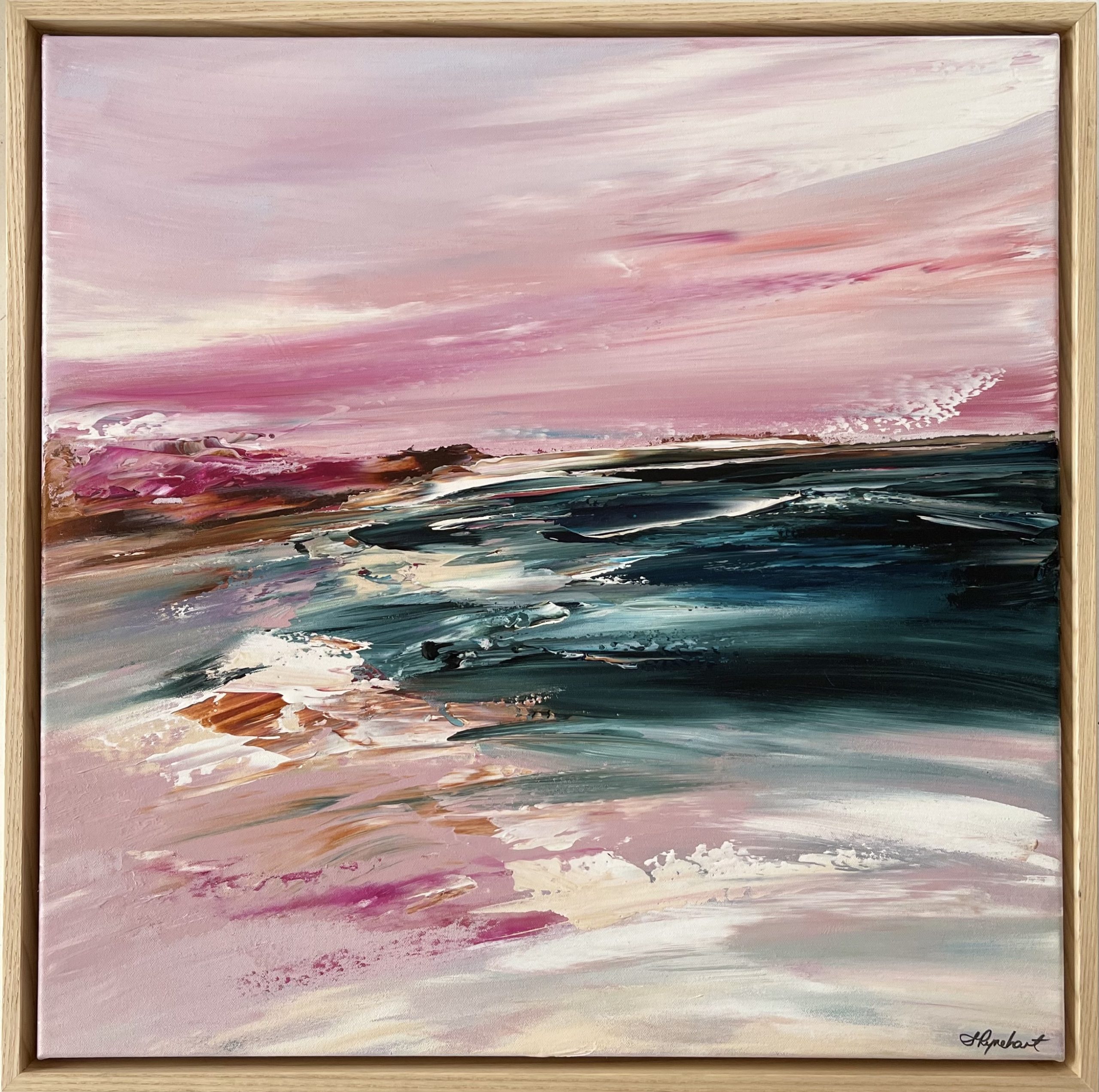 “In A Heartbeat” is inspired by the call of the coastline at sunset – I answer in a heartbeat. No hesitation, no doubts, no fear…I just go. I wander the shoreline reflecting on the day that’s been, hopeful for the days to come, trusting that when the sun rises again the next day it brings new hope. Healing. So too did this artwork cry out to be painted. The magenta pinks and deep greens are my absolute favourite colours and on a darker day I instinctively reached for them to bring this stunning seascape to life. When I’d finished it pulled at my heart big time. My heart actully did skip a beat! I’ve hung on to it for a little while because I couldn’t bring myself to let it go. But now I can, hence you looking at it here for sale. “In A Heartbeat” will hopefully have that reaction for you too, and inspire you to move forward, without hesitation, at whatever is holding you back…responding in a heartbeat.