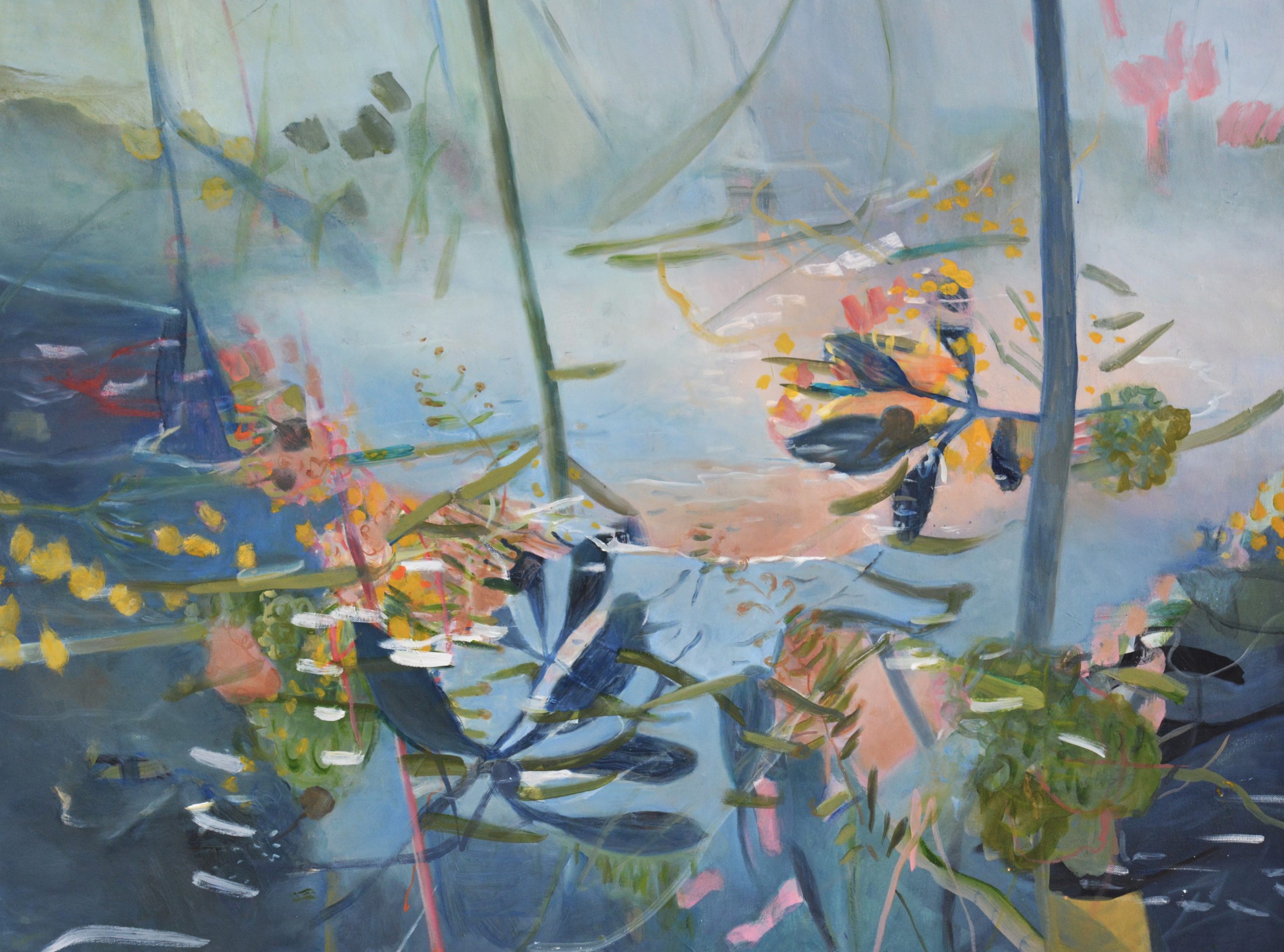 “In Between flow and stillness” by Dianne Smith is inspired by nature’s quiet moments in a creek bed. I am fascinated by sunlight merging with plants and reflections and how fleeting shapes and colours dissolve into new forms. There is so much beauty in the ephemeral.