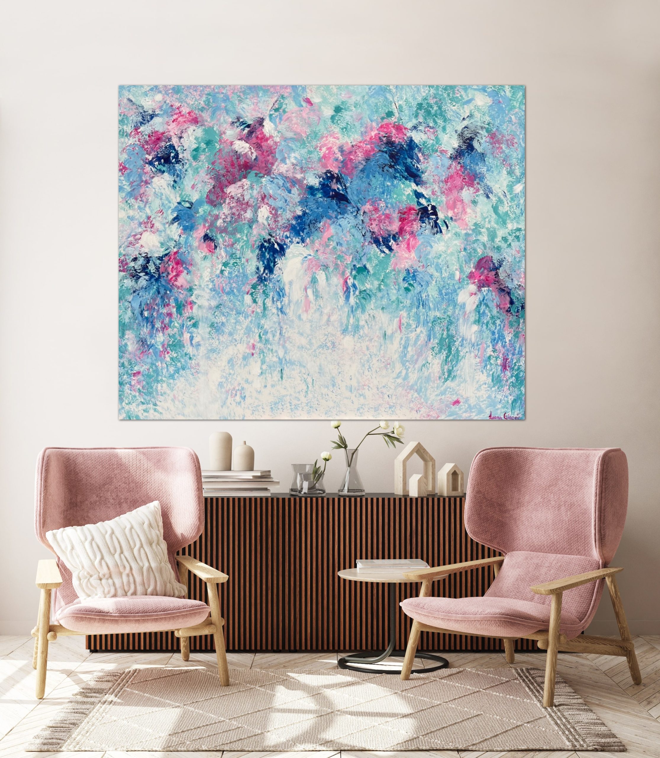 This artwork highlights the fresh colours of Spring and Summer. The beautiful weather and fresh flowers always add a sense of joy to a day. A vibrant painting with lots of colour and depth and a great addition to brighten any space.