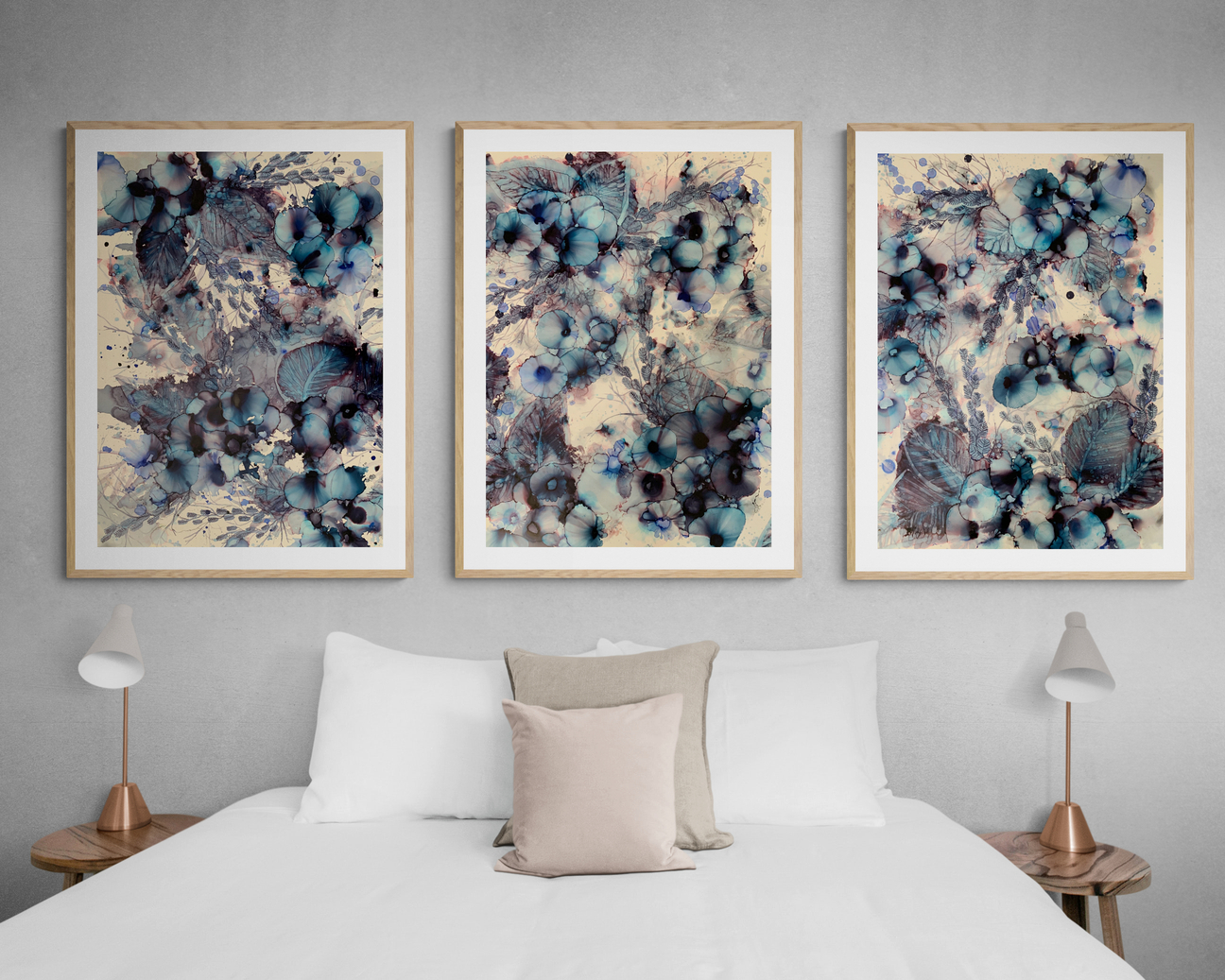 Original triptych 65 cm x 91 cm x 3 Alcohol ink on yupo paper sealed with high grade varnish and UV spray.