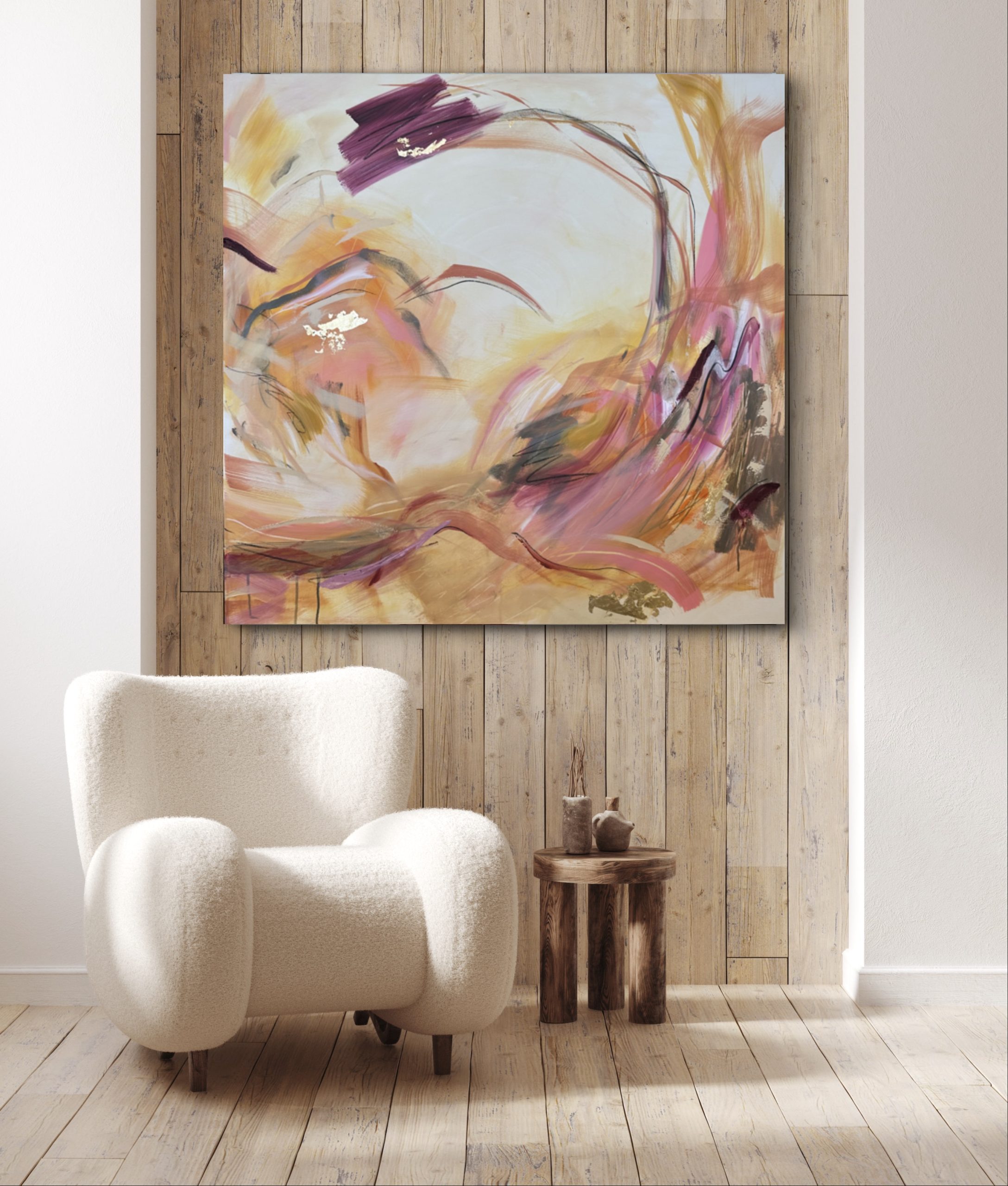This artwork has lush strokes in shades of beautiful pinks, oranges, ochre and burgundy, with flourishes of gorgeous gold leaf.
