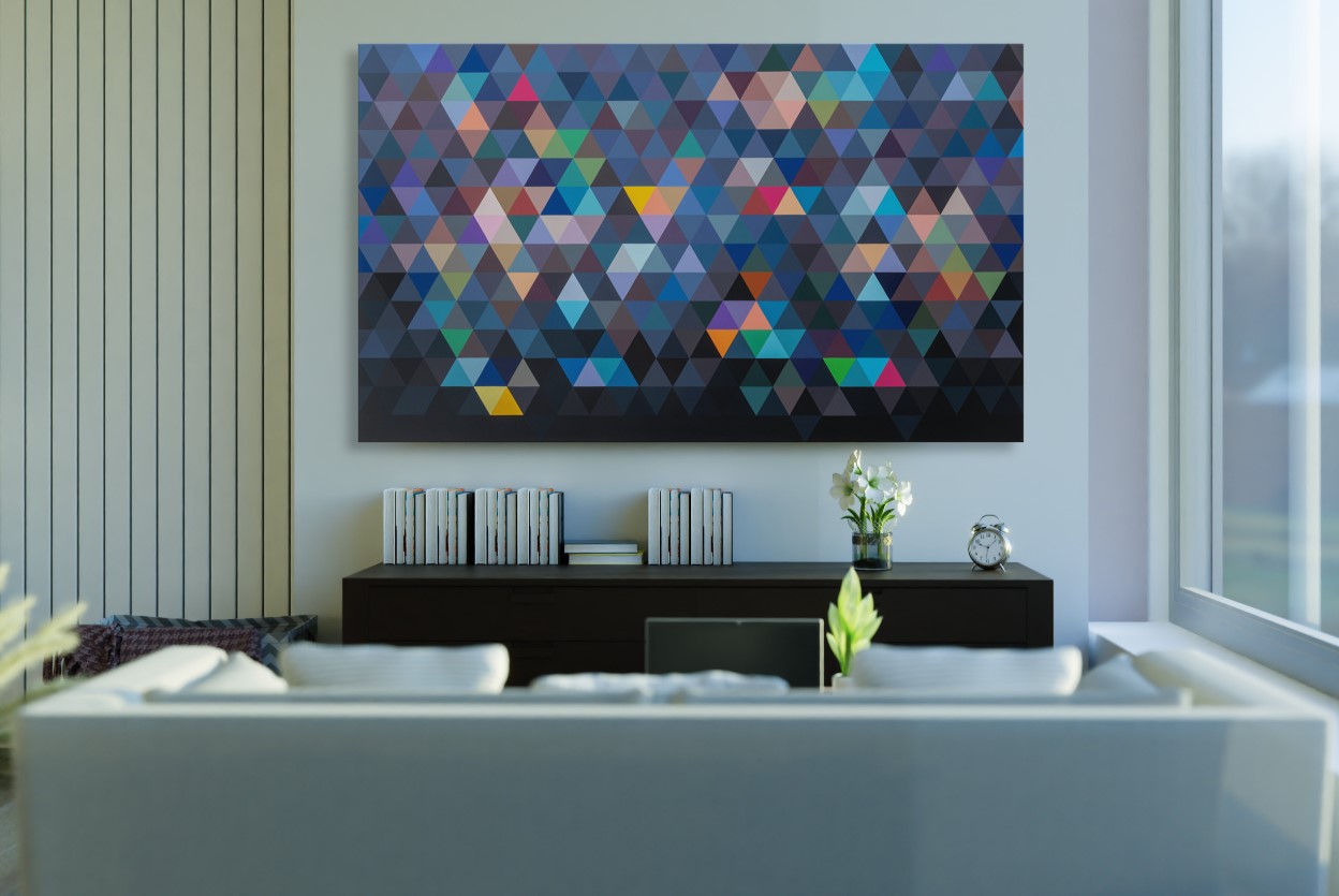 Using her signature geometric precision, Min visualises these questions on canvas. A glowing central beam—constructed from hundreds of meticulously arranged triangles in luminous blues, teals, and cyan—cuts striking through a deep, dark void.