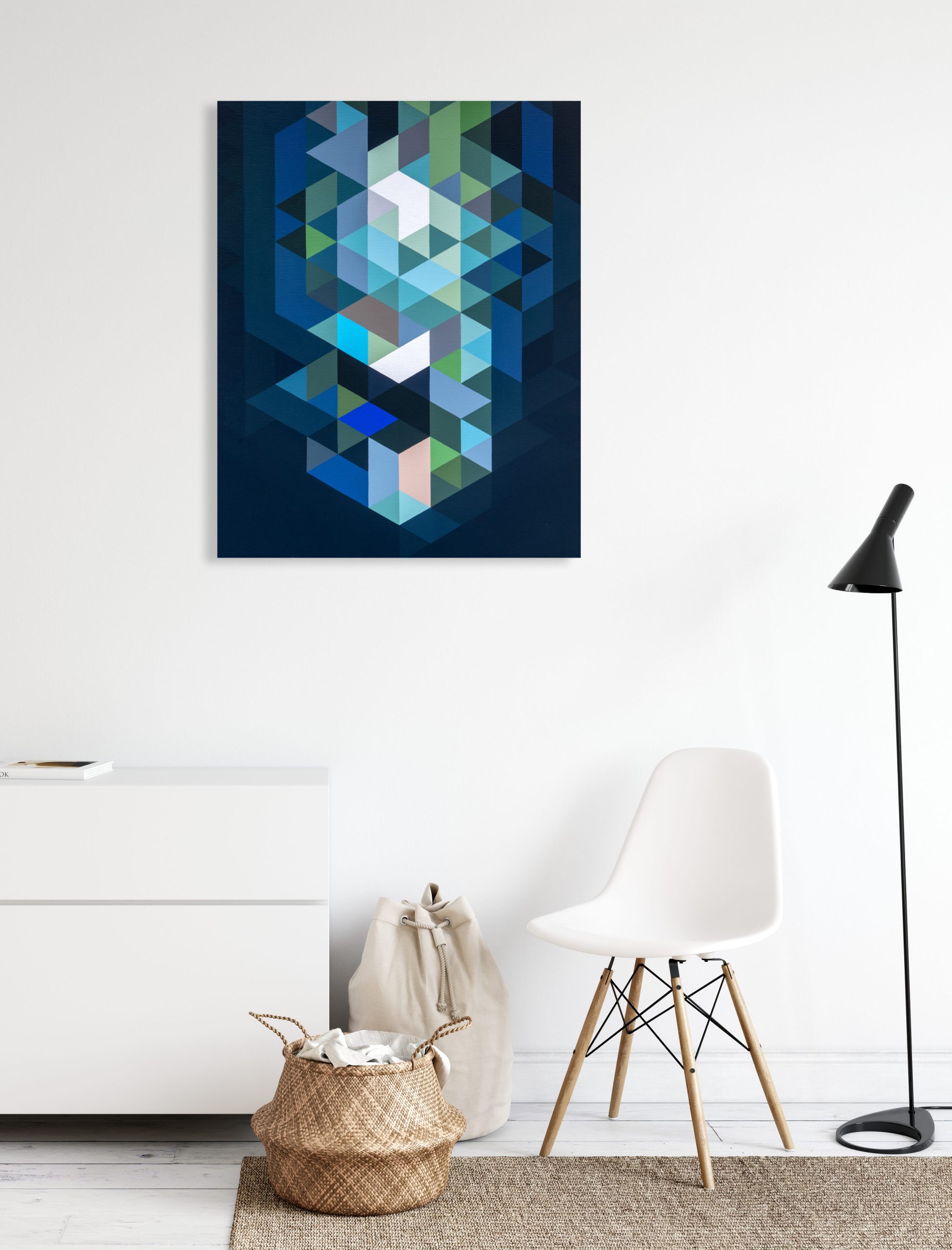 Using her signature geometric precision, Min visualises these questions on canvas. A glowing central beam—constructed from hundreds of meticulously arranged triangles in luminous blues, teals, and cyan—cuts striking through a deep, dark void.