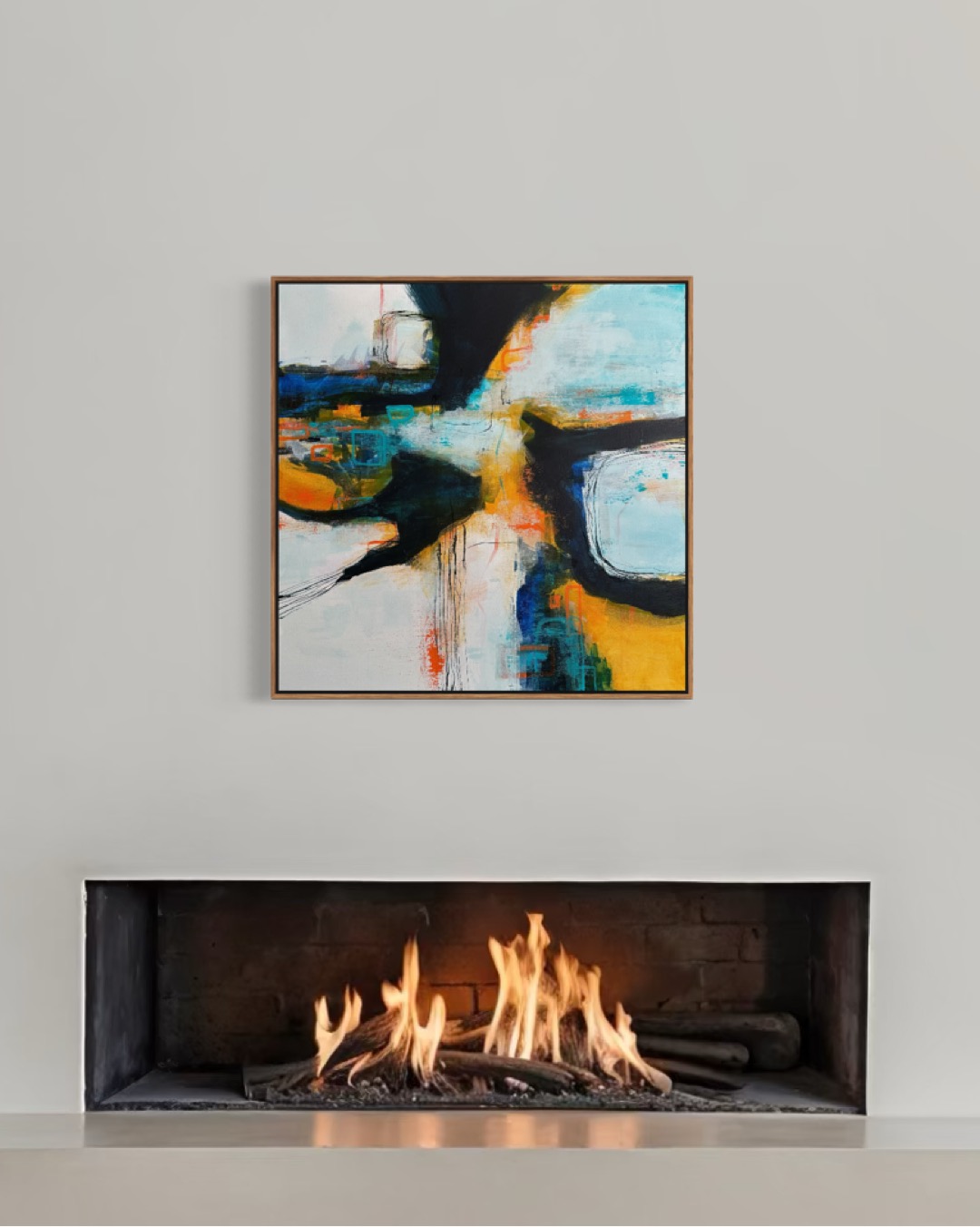From the series – In search of connection. I love creating wonky lines with sticks dipped in ink, I love the tension between a strong value contrast and complimentary colours, in this case the orange and blue. All this adds to the emotional depth of the artwork.