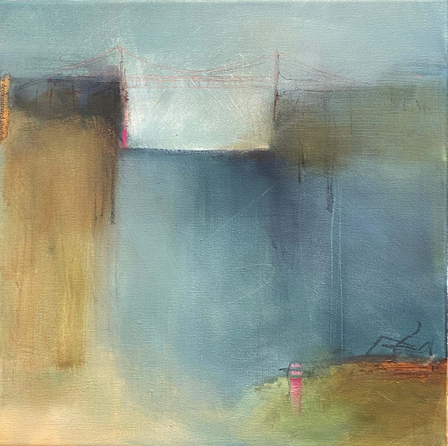 In suspense is a coastal inspired painting showing a high cliff and headland with a tranquil sea or bay between. Â If you look carefully, you can see a bridge suspended. Â This little painting is the perfect size to place between your favourite books on a shelf or in a small space.