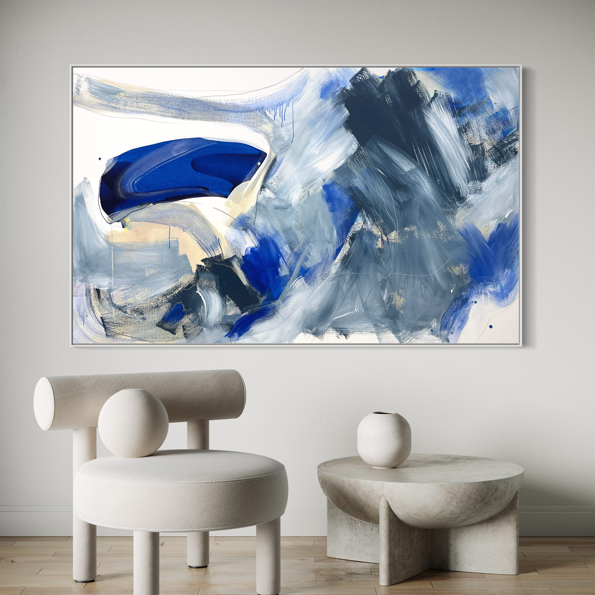 This large painting has areas of texture and gestural marks in paint and pencil across the canvas surface. It’s striking palette consists of white, neutral, beige, grey, blue, dark blue, light blue and brown with a hint of beige, yellow and peach.
