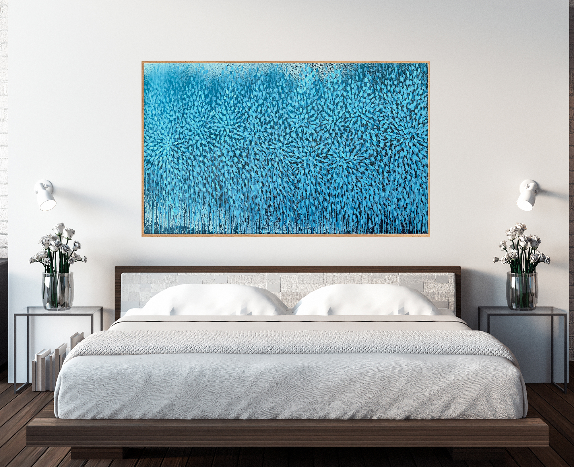 In the Deep of You and I, by Leni Kae – A blue abstract landscape painting by Sydney artist Leni Kae, with white and deep indigo background. From her series “Healing Landscapes”, this artwork represents swimming in the depths of emotion with someone we connect with, and the space that then further opens up to allow this connection to flow and further deepen. Created with tone of blue, indigo, white, pearl white, it makes a beautiful statement artwork for both lounge room and bedroom interior design or interior styling. For bedrooms, this artwork is best suitable for a Queen Size bed dimensions (framed or unframed).