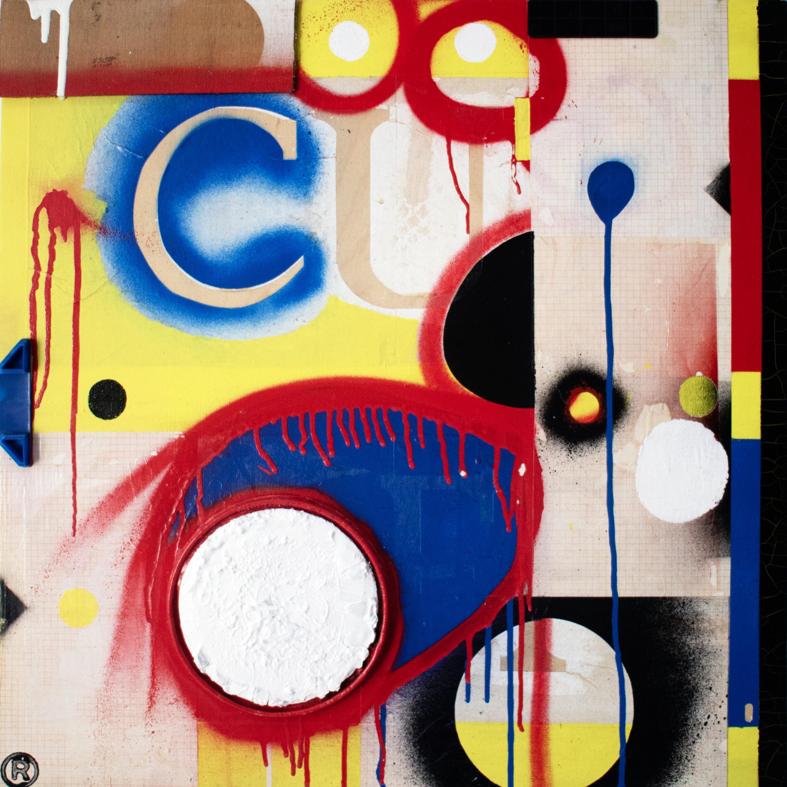 Acrylic, spray enamel, paint tin lid, and collage on birch board, 2017 – 2025.