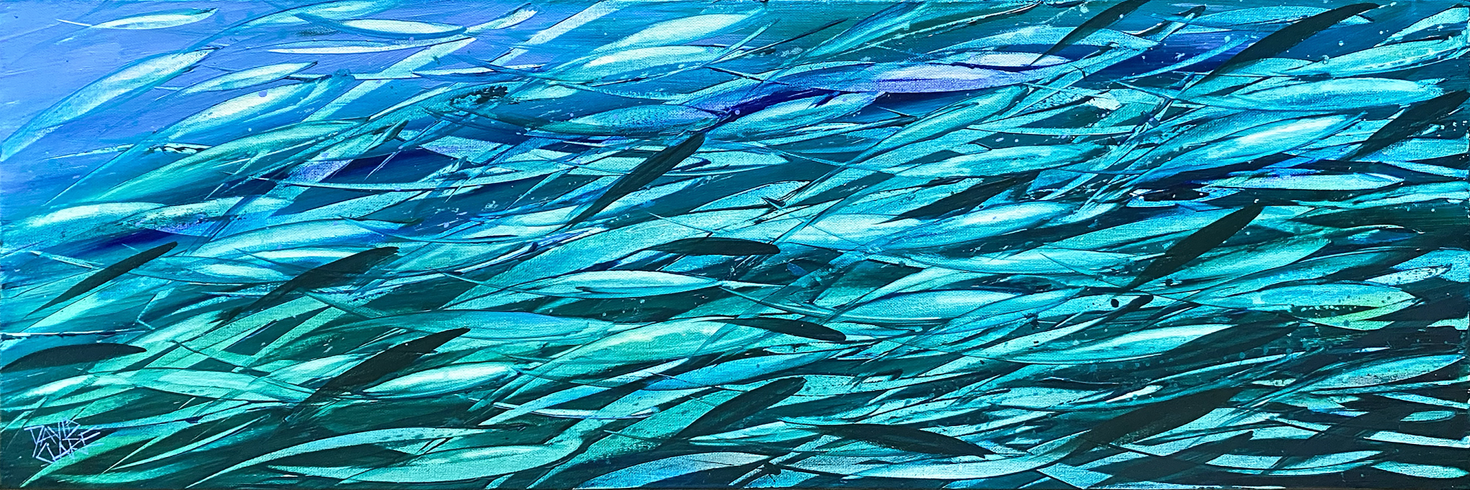 In The Eye Of The Storm by David Clare – Original abstract painting of a colourful school of fish. I am endlessly inspired by underwater scenes, especially schools of fish. Their shimmering movement, and the beautiful colours of the ocean are irresistible.