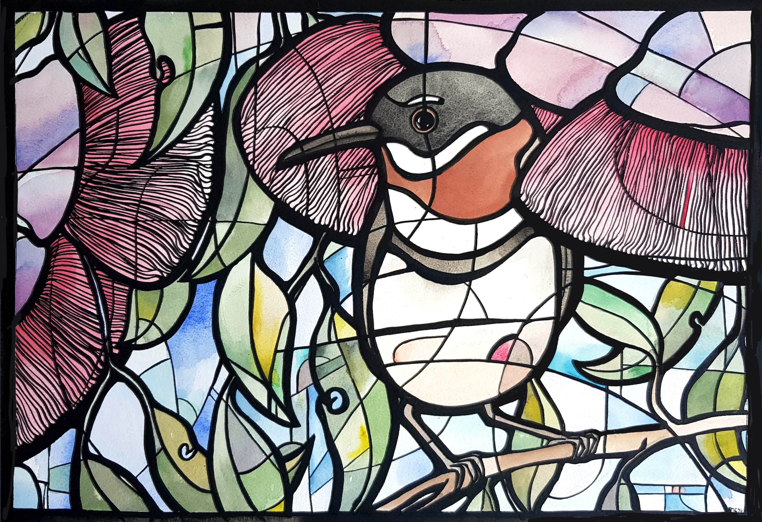 Painted on textured Arches watercolour paper the layers of colours are built up and range from flat to textured paint. The image is overlaid with organic ink linework which accentuates the light-filled areas and gives the effect of stained glass.