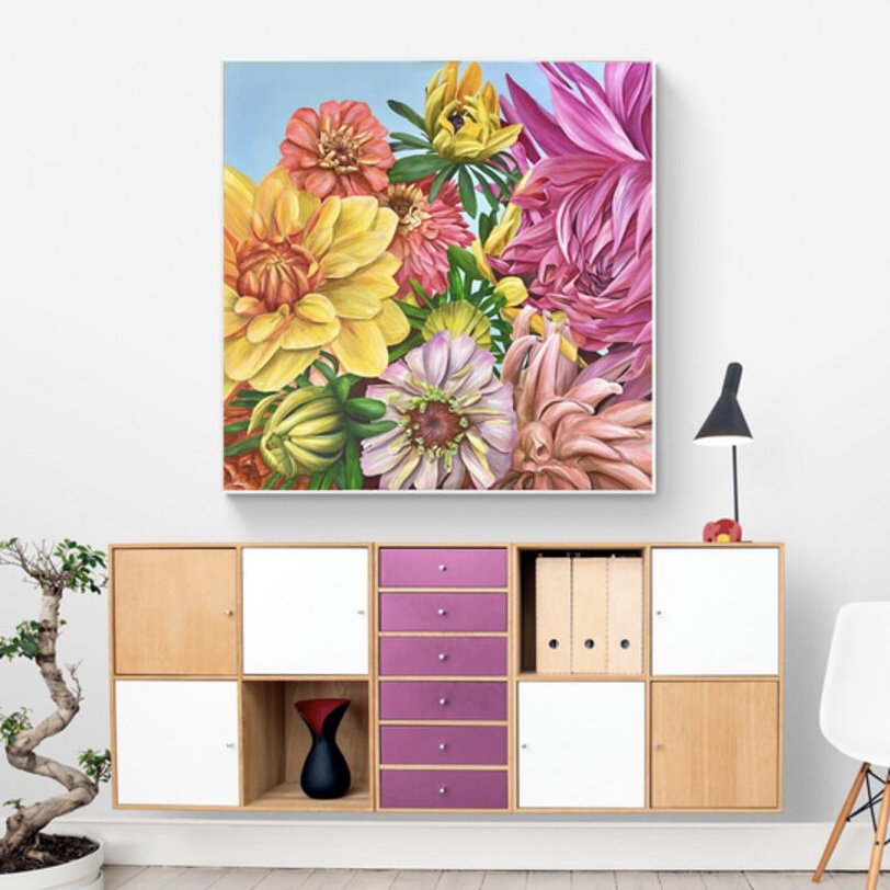 This piece incorporates a few of the blooms I love and the colours I love. I call these colours my ‘happy’ colours and it was indeed a happy time creating it. This can be hung portrait or landscape as many of my creations have that diverse flexibility.