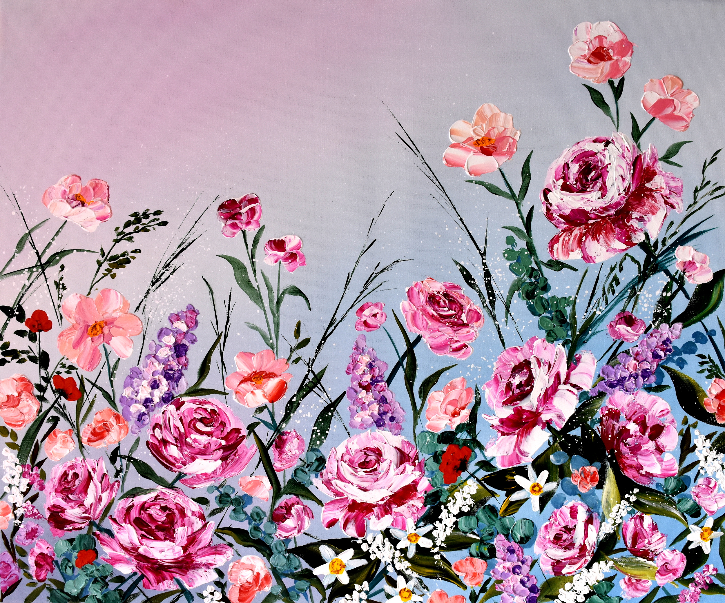 In the Meadow – textured flowers painting by Eva Pearl – Acrylic on canvas, stretched and ready to hang. There is a lot of texture in this painting. This impasto painting was created using a combination of brush strokes and palette knife techniques. It has layers upon layers of textured high quality acrylic paint.