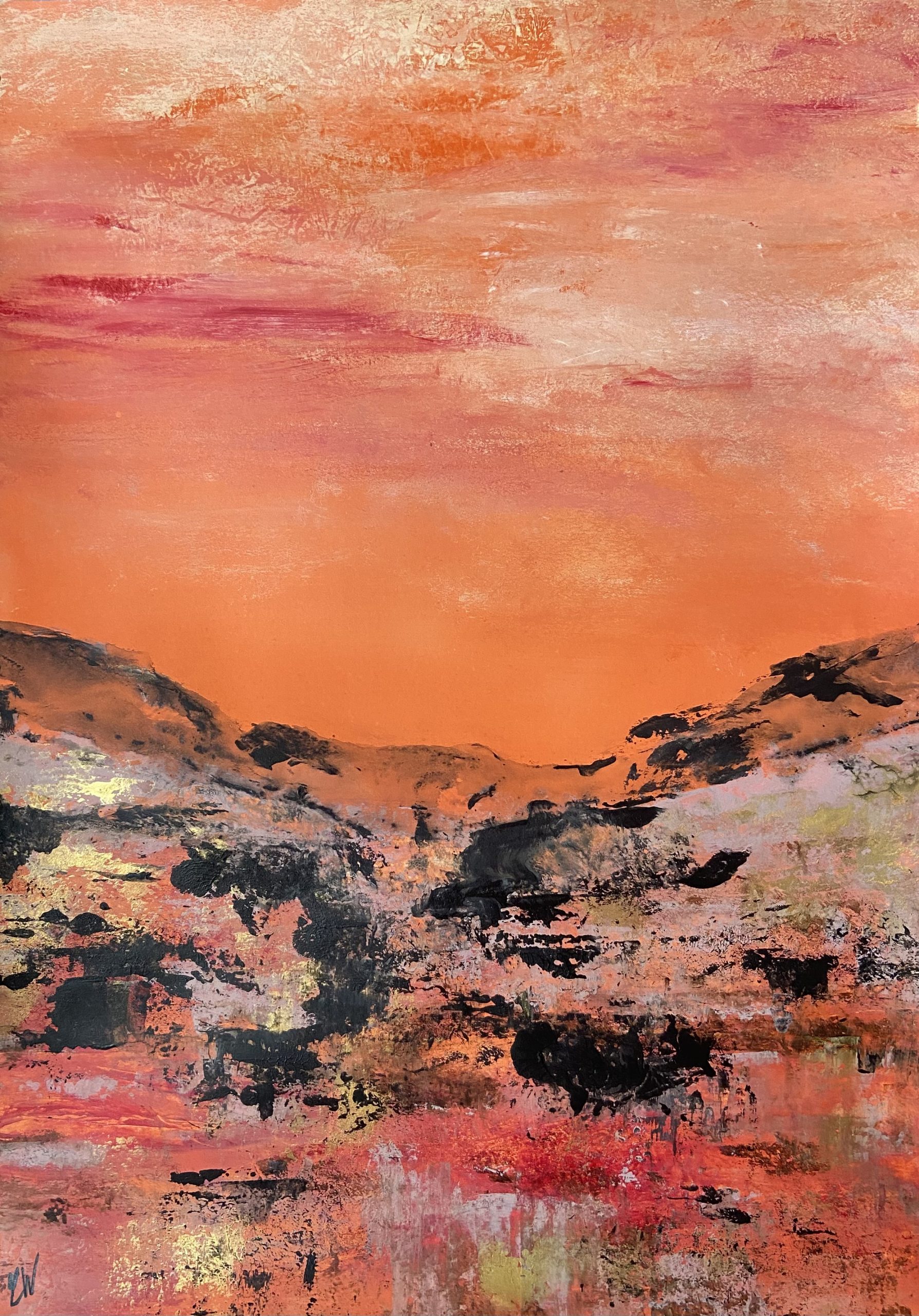 A beautiful abstract landscape painting with shimmering gold accents. 59.4 x 42 cm (A2 size). Acrylic on paper. Frame not included. Requires framing.