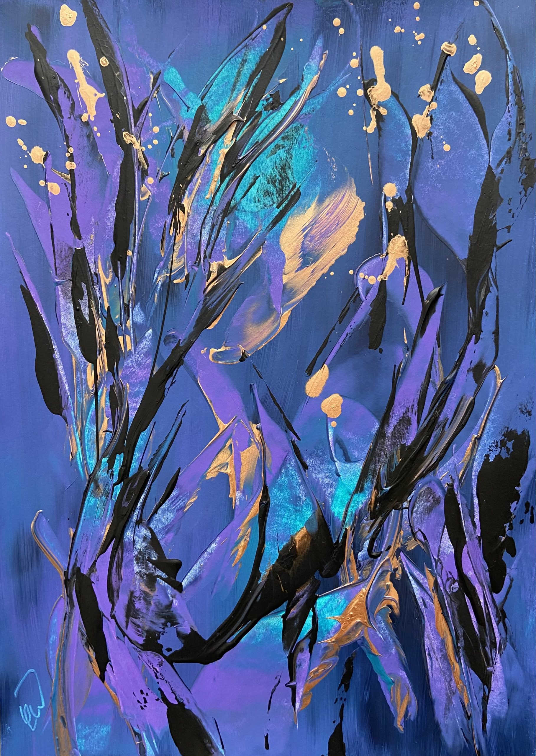 In The Shadows by Carrie Welsh is a pretty abstract botanical piece that has beautiful captured movement and metallic accents. Some images show what this piece looks like framed. Frames not included. 29.7 x 42 cm (A3 size) Acrylic on paper. Requires framing.