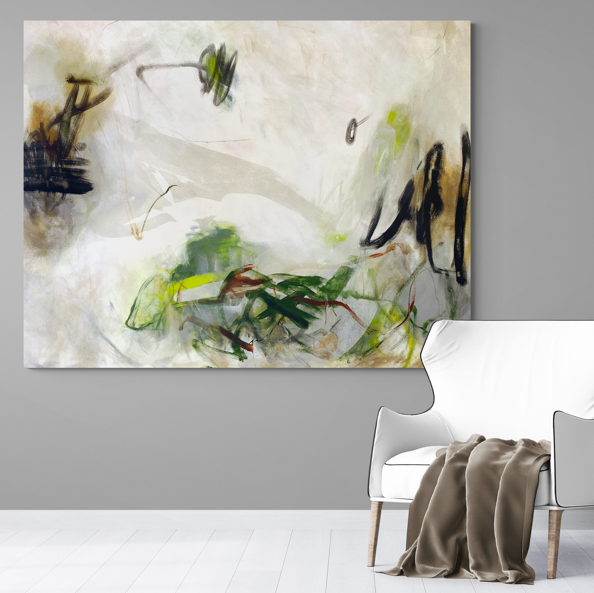 In The Silence has a striking palette of light and dark green mixed with, beige, grey, ochre, brown and rust tones ties together beautifully against areas of black and white which makes this piece come alive.