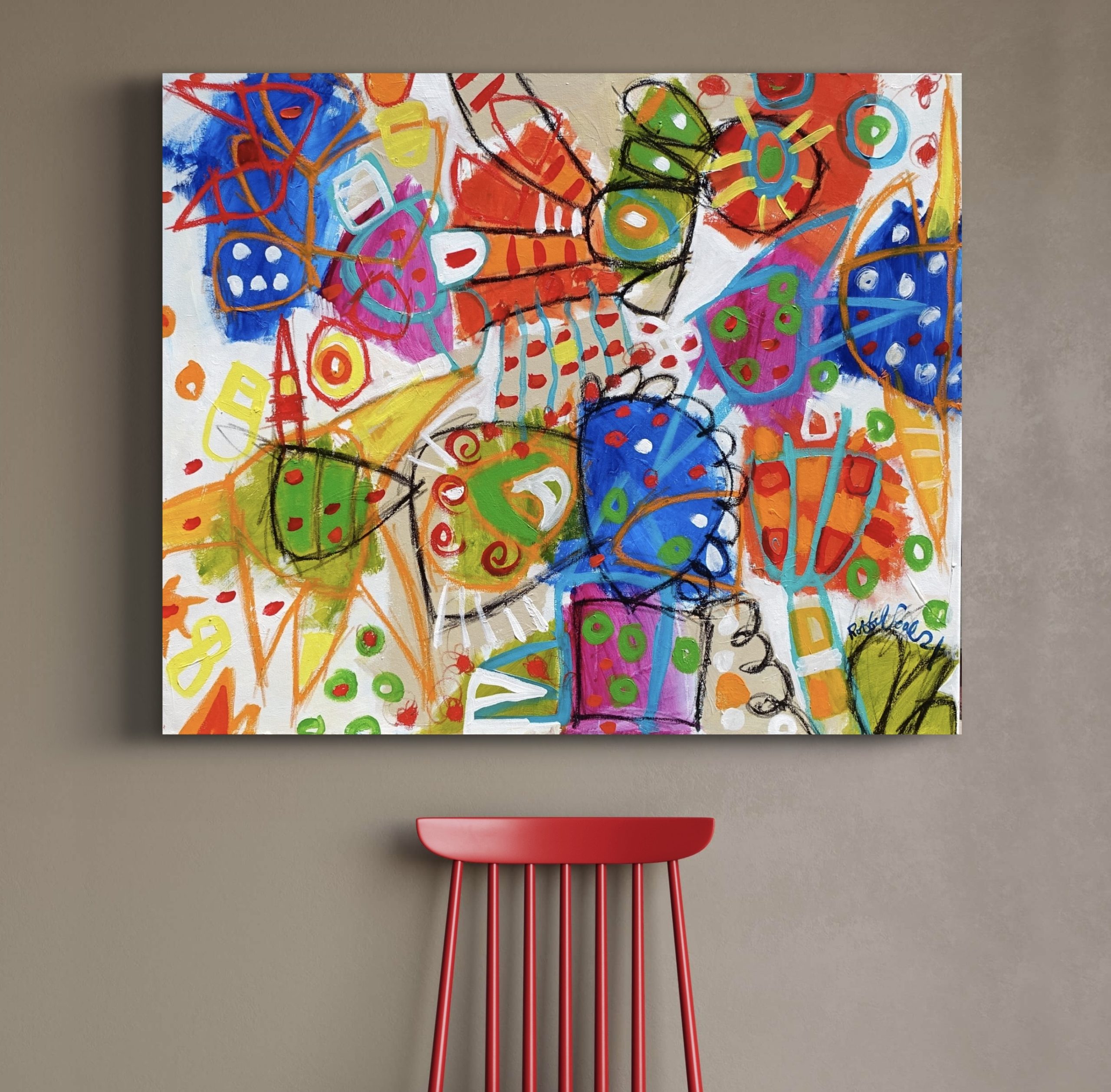 This work is sent without an exterior frame (images are to give an idea of what it would look like with an exterior frame). I have mainly used a white frame in the images, which is unusual for me but I just felt a black frame was too heavy and natural timber frame was too depleting for such a happy work.