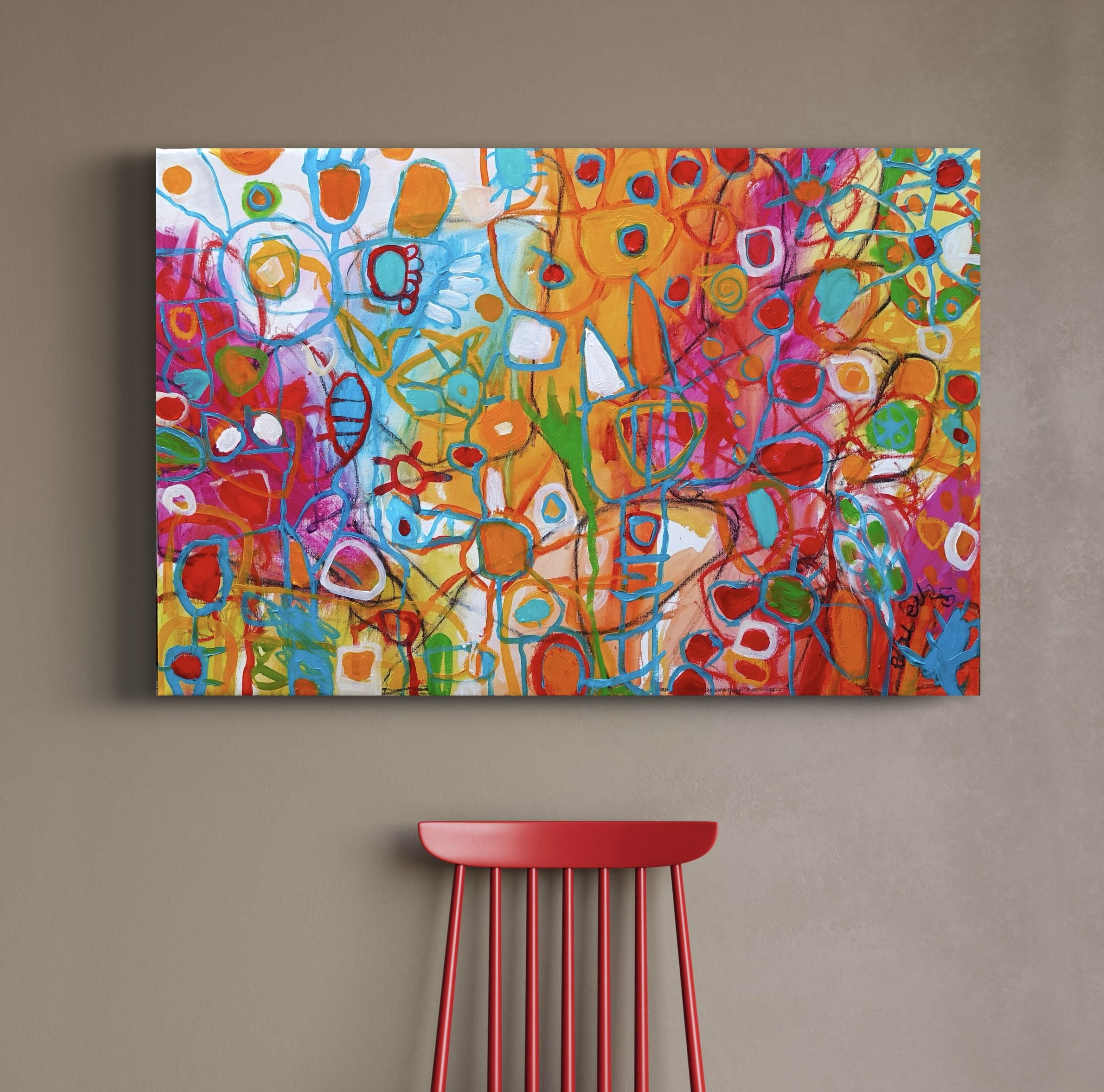 The work is sent wired ready to hang but without an exterior frame (images are to give you an idea of the painting framed only. The work is painted is continued on the sides so if hung as is, stretched without an exterior frame it will still look lovely from any angle (no ugly white sides). I actually hang all works in my house without exterior frames because I feel that allows the paintings to continue beyond its borders. But this is just my personal preference so I have included some images with different frames.