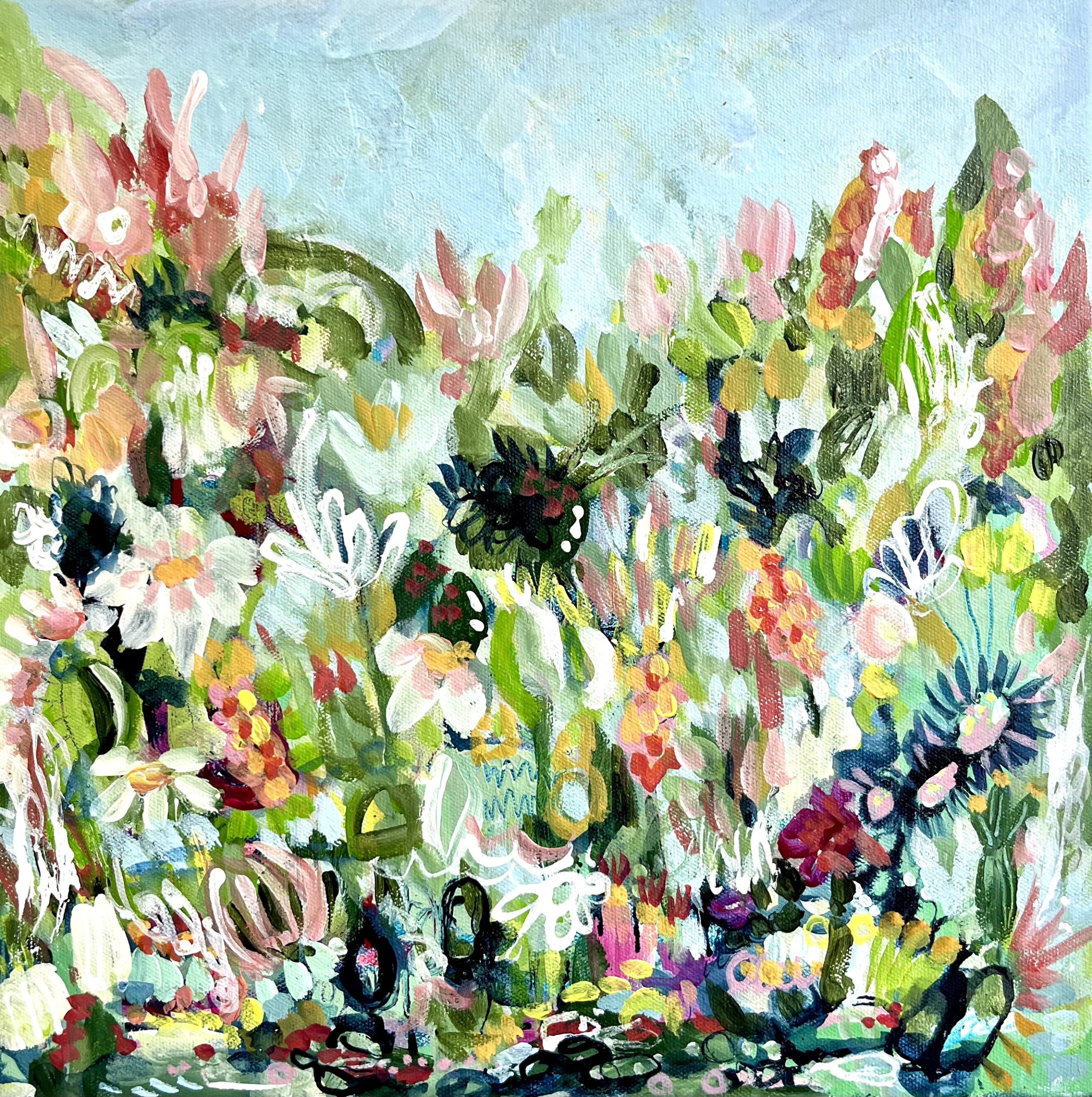 Deep layers of nature to meander your way through. Spring has sprung with all the blooming colours. Let your eyes wander around the canvas to find connections in all the marks.