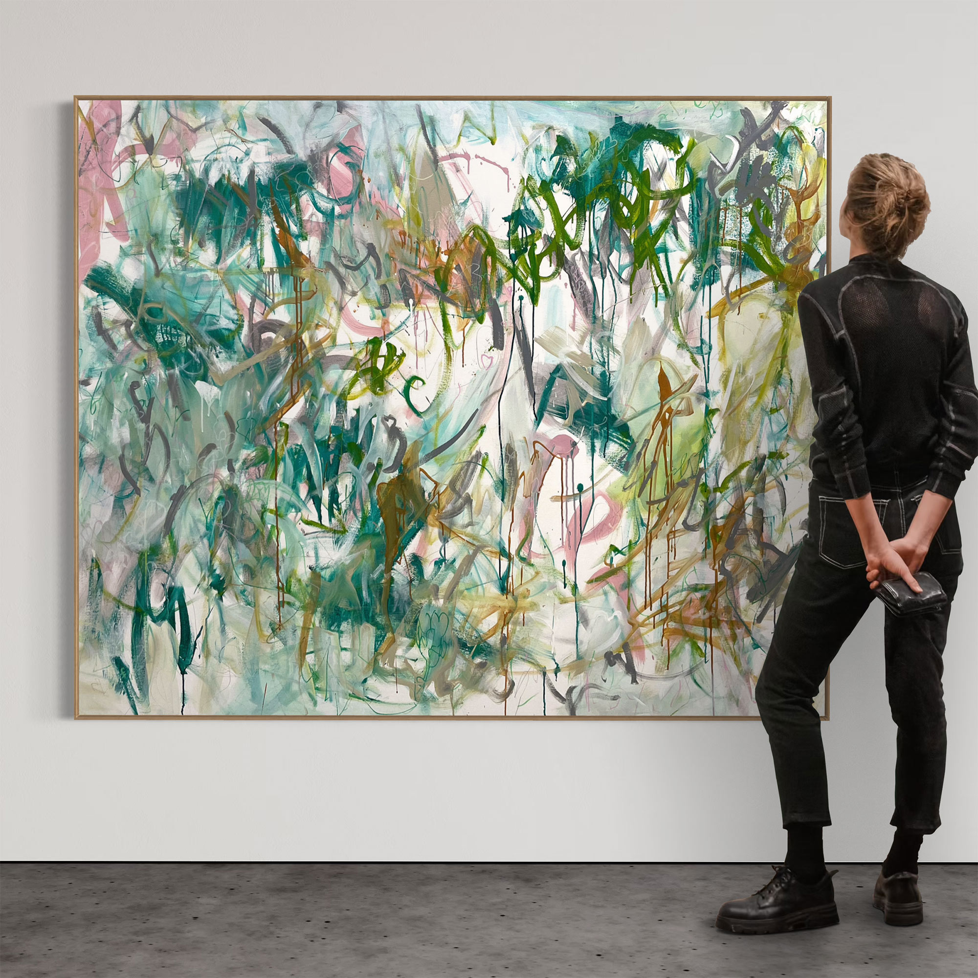 This stunning piece combines complex mark making and texture with a beautifully balanced palette of white mixed with areas of light green, grey, dark green and olive with pops of pink pink blush, tan and ochre.