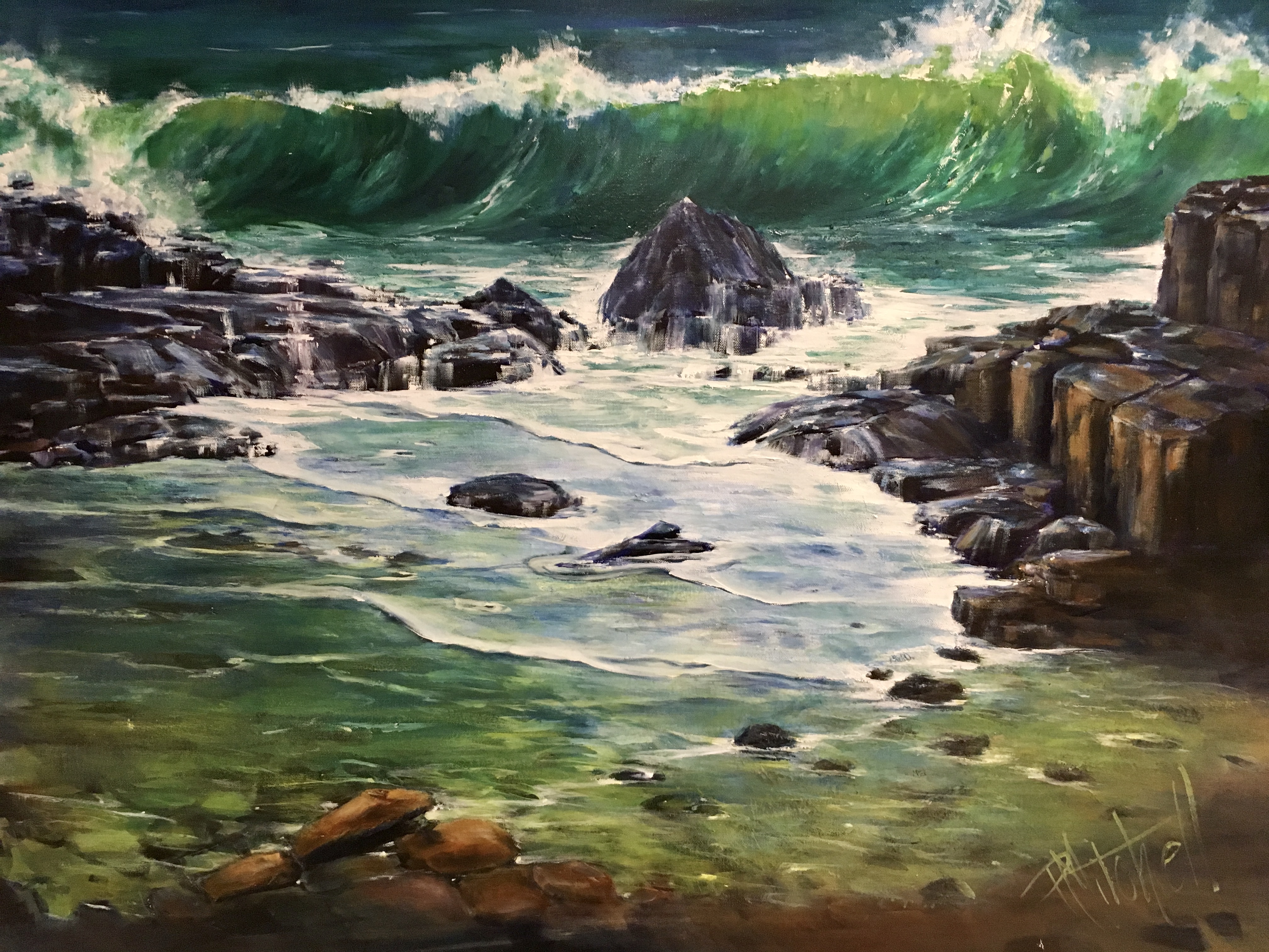 Walking the beach and watching the tide coming in inspired this artwork. The juxtaposition of solid rock against incoming rolling waves, the soft and the hard, echoing life, made an impression I wanted to capture.