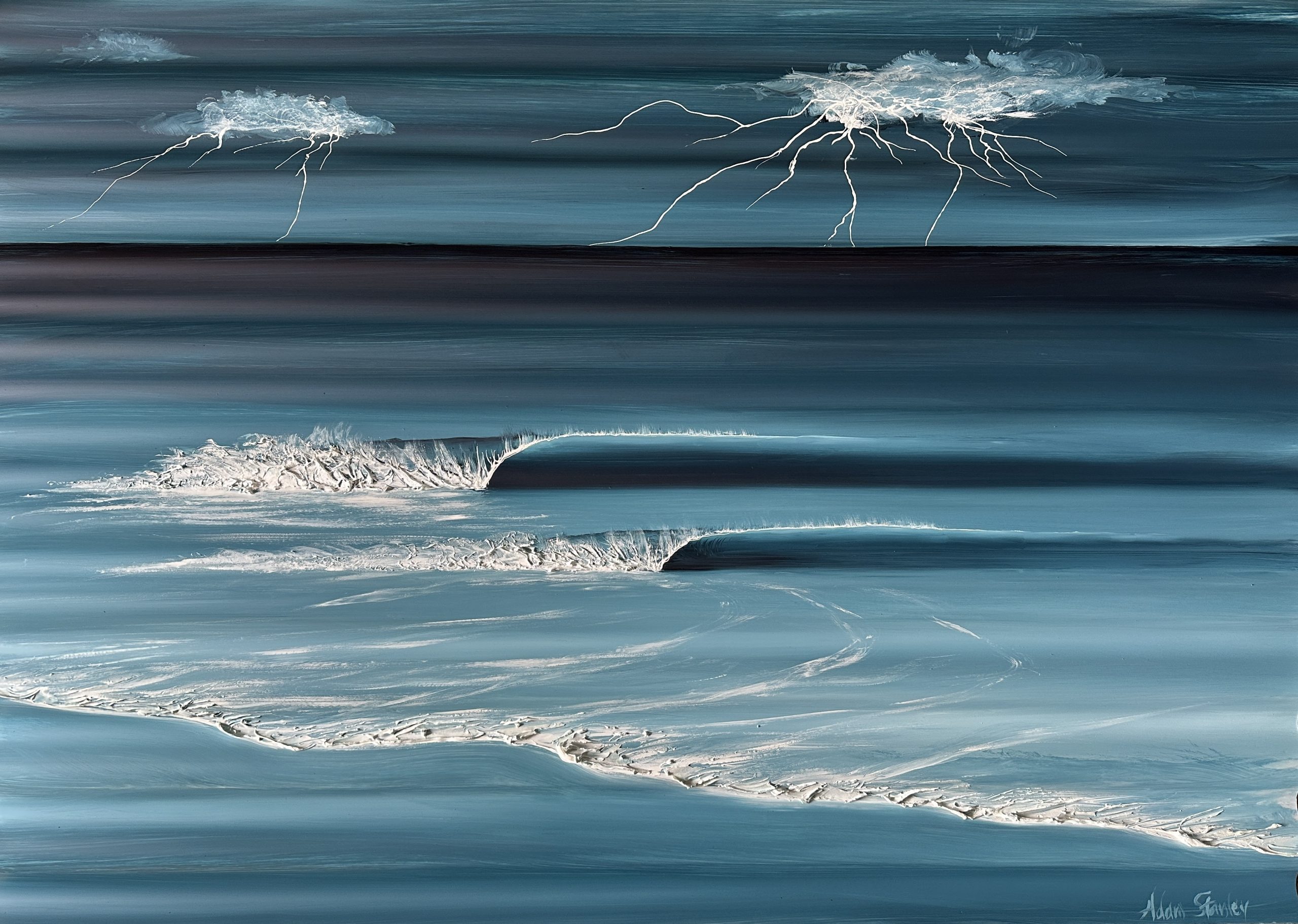 Indigo Lightening by Adam Stanley – in this painting I have created a 3D depth in the waves by painting on corrugated polycarbonate.  These paintings are outdoor resistant and hang flush on a wall even better than other paintings.
