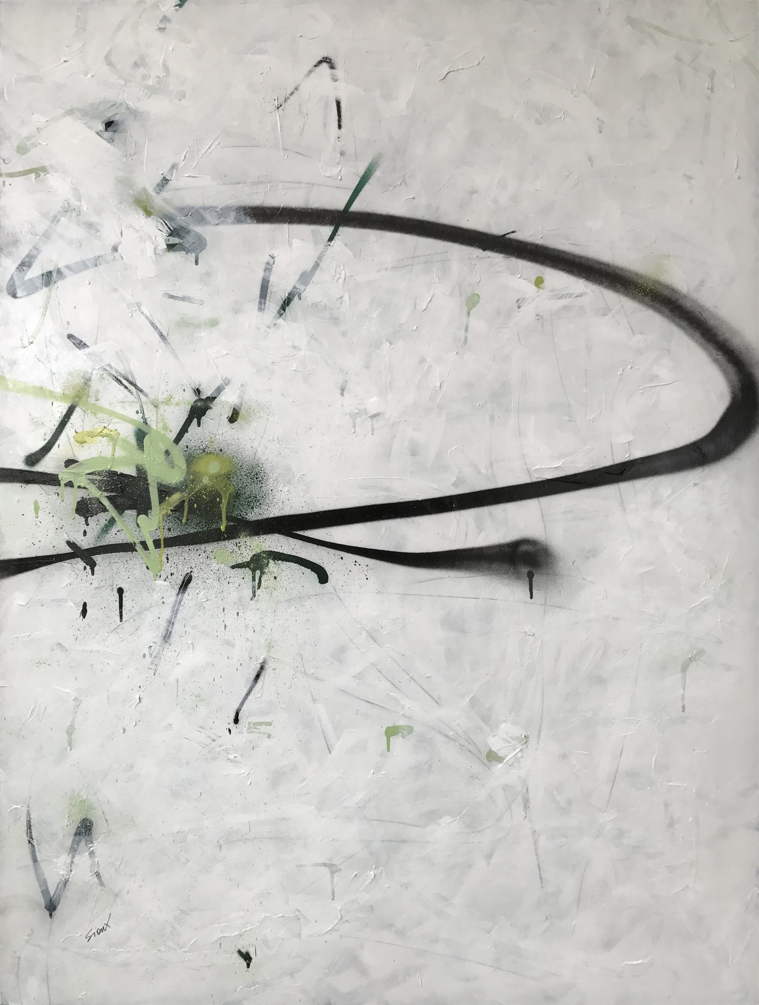 From a series titled HYBRID. Examining abstract expressionism and street art movements, I’ve used acrylic paint, aerosol, ink and pencil to create an unconscious emotive response. The artwork is full of angst and attitude, edgy and urban, with a contemporary abstract nature. I was very physical when creating this piece, injecting my energy into it.