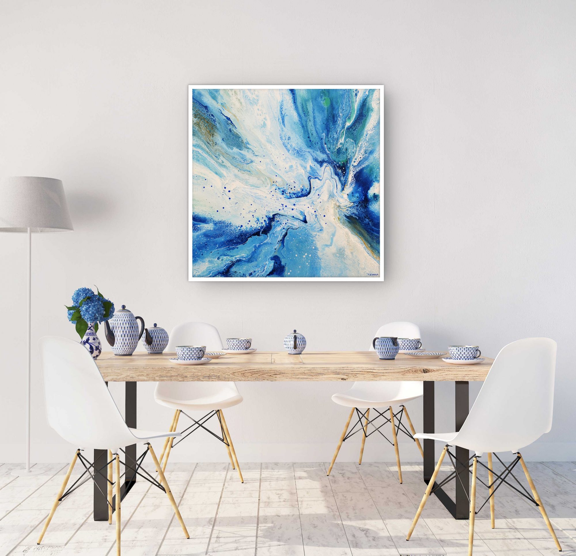 This painting depicts a sequence of reasoning or justification which can never come to an end. An Infinite Regress arises when we ask what are the justifications for the reasons themselves. If the reasons count as knowledge, they must themselves be justified with reasons. Blue and white infinitely flowing together, never stopping, with only the odd pause of the flow represented by splatters of colour and gold highlights. A bold striking statement piece designed for any room which needs a splash of infinite colour flow.