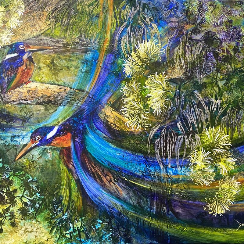 An original acrylic and mixed media figurative painting on stretched canvas. Using handmade textured paper and georgous Japanese Washi paper, paired with acrylic paint to create a beautifully textured and feminine piece