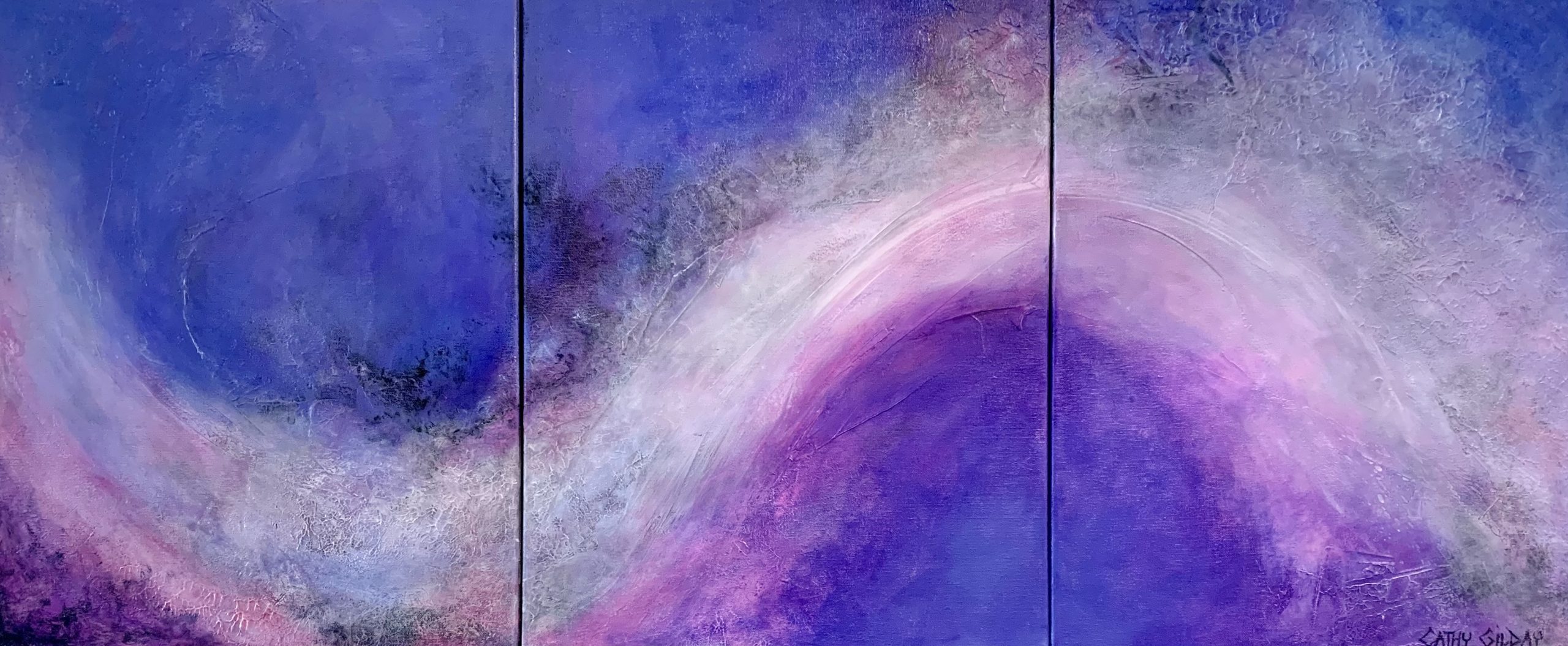 Inhale, Exhale, Repeat by Cathy Gilday – In this triptych abstract-expressional painting, I am expressing on canvas, the concept of breathing through a situation. Being mindful and controlling the urge to implode or explode, by simply focusing on your breath and going with the flow. Multiple layers of coloured glazes have been applied to achieve depth of colour, adding an overall mystery to the work.