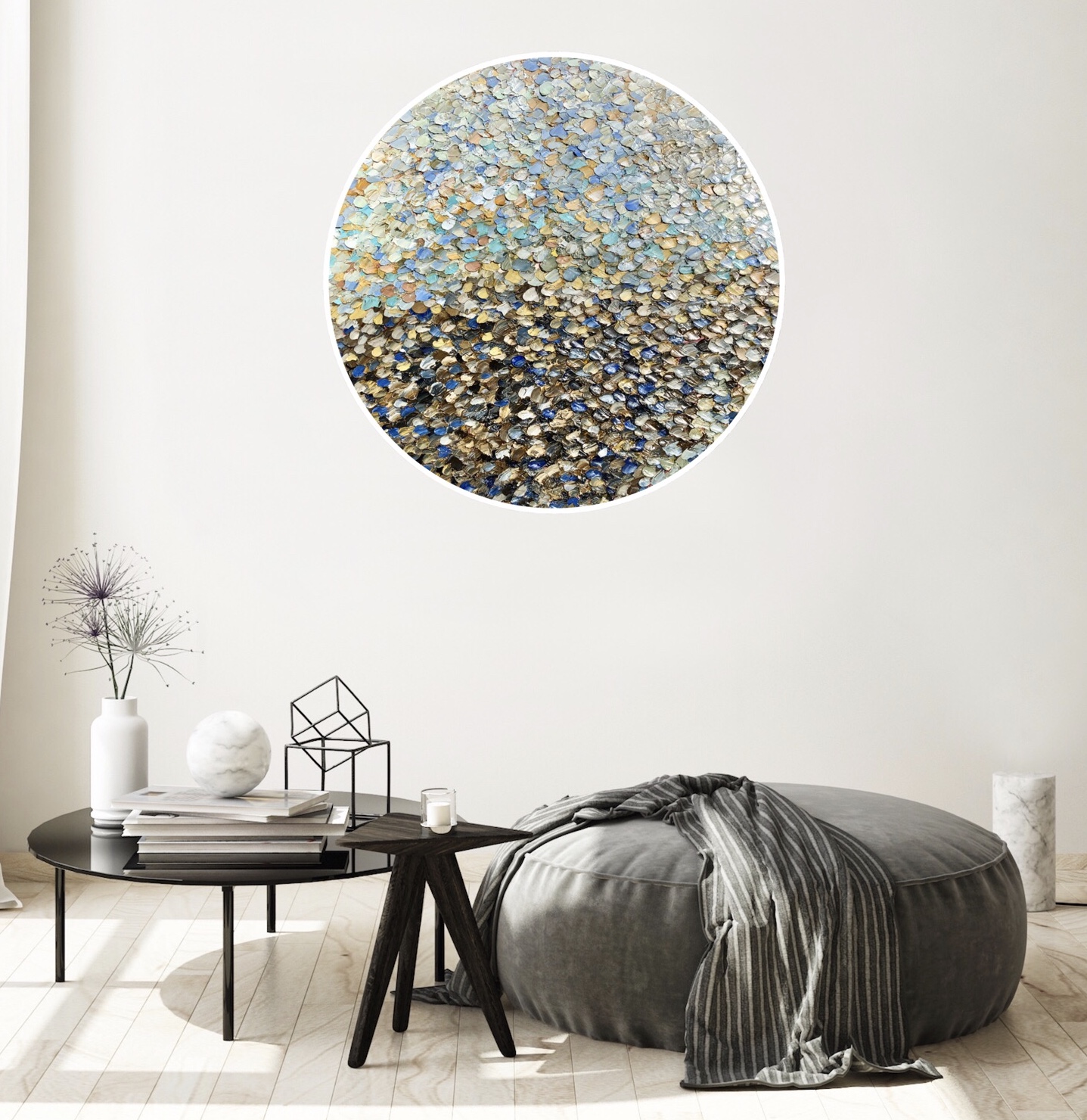 Inner Beauty by Theo Papathomas is a very textured painting with so much depth by creating lots of layers of paint giving it a three dimensional feel . The painting is stretched on round frame and ready to hang. Petals falling from the sky falling onto the landscape, creating a beautiful bed of petals .This painting is painted with a pallet knife with thick oil paints on canvas. Hope this painting makes the viewer feel peaceful and tranquil.The painting is signed and dated 2020 at the back and comes with a certificate of Authenticity.