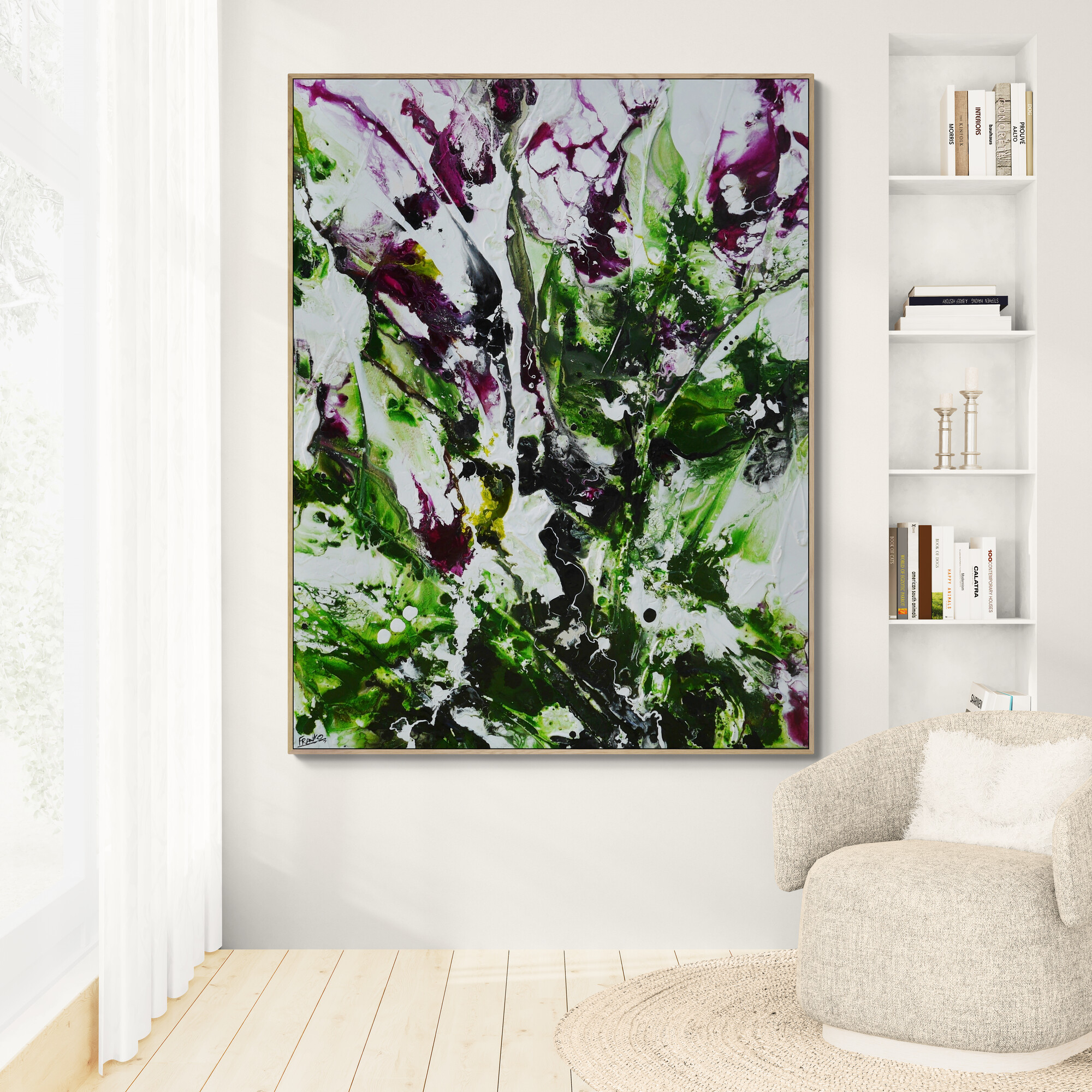 Buenjourno spunky art lover 🙂 and Grazie for taking a peak at “Inner Bloom!” This natural beauty features tones of olive, greens, plum, white and black acrylics, inks and oils on a textured and layered canvas base! A floral vibed piece that will be the star of any room!
