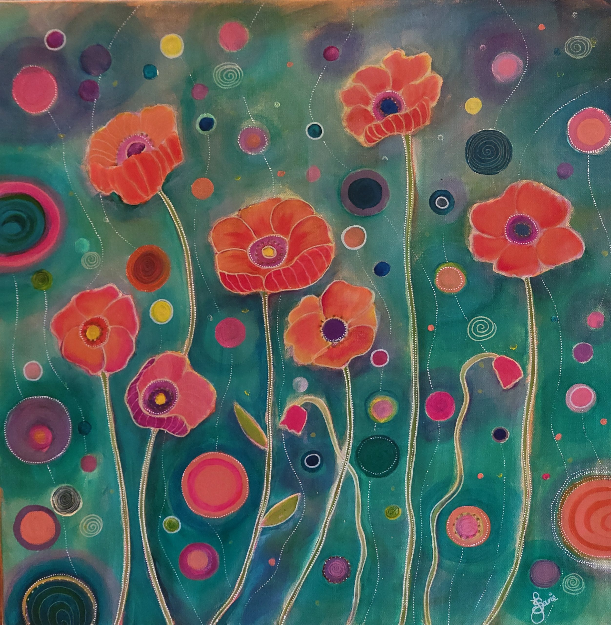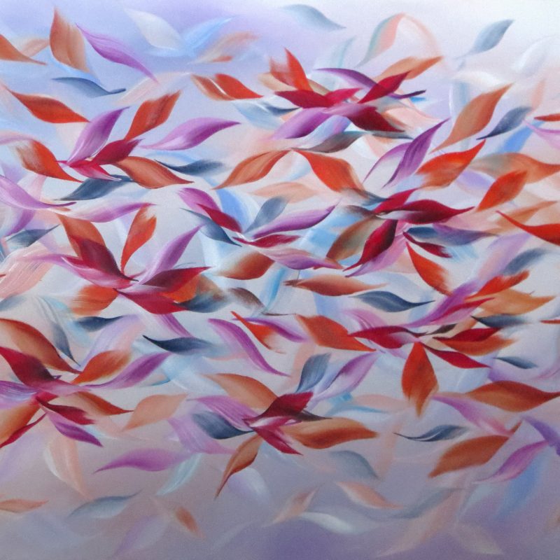 Bright beautiful colours burst forth from this intuitive canvas, a vivid palette that speaks of joy and hope.Â
