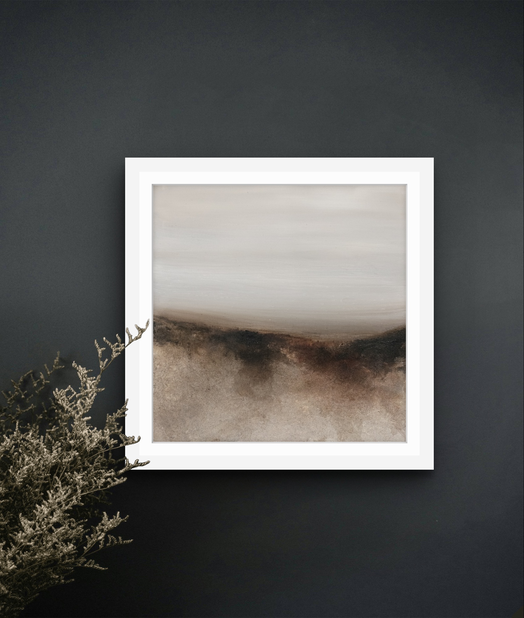 “Inner Peace” depicts a serene landscape scene. The upper portion of the image is filled with soft, neutral tones, giving the impression of an overcast sky or distant fog. The lower portion transitions into darker, more textured hues, where earth tones of brown and black suggest a rugged terrain or barren landscape. The blending of light and dark tones creates a calming, almost ethereal atmosphere, invoking a sense of quiet isolation and ‘inner peace’.