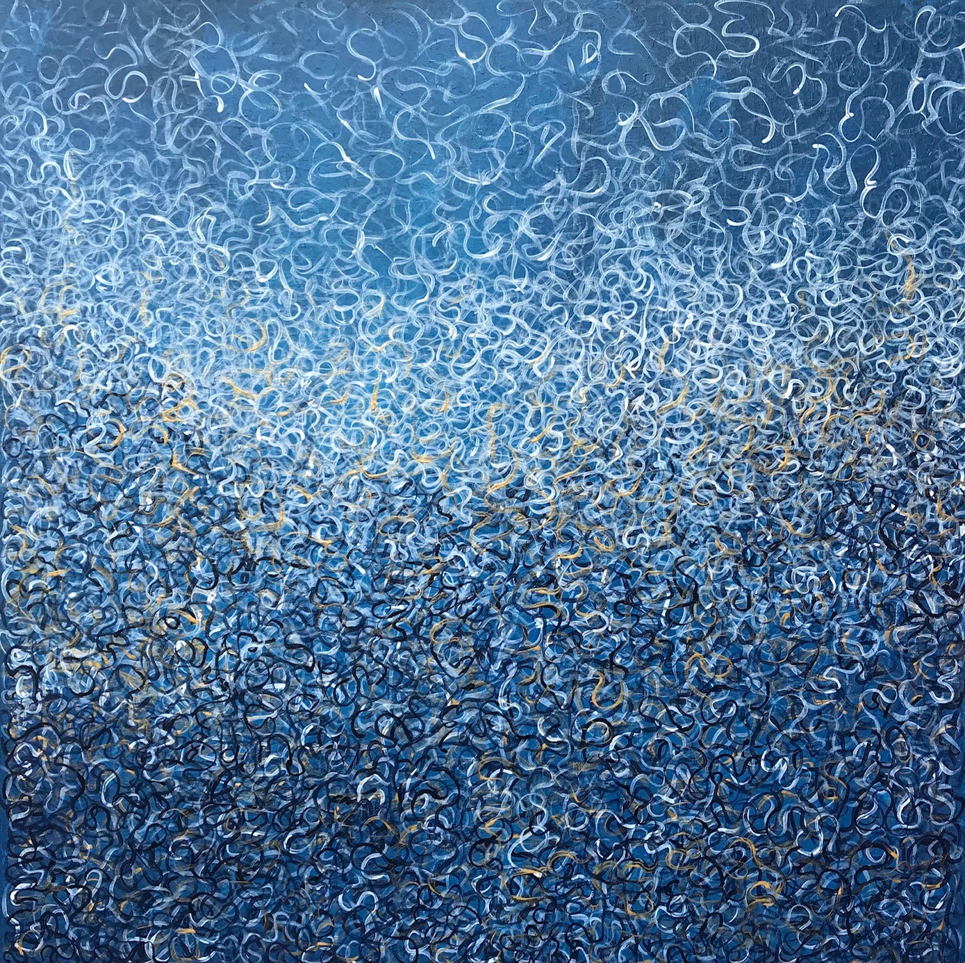 Layers of colour painted onto the canvas. Using the brush to create the organic lines, which reflects movement. The swirls, applied one on top of the other. White, Blues and gold. Look at the close up photos and you will see the detailed work.