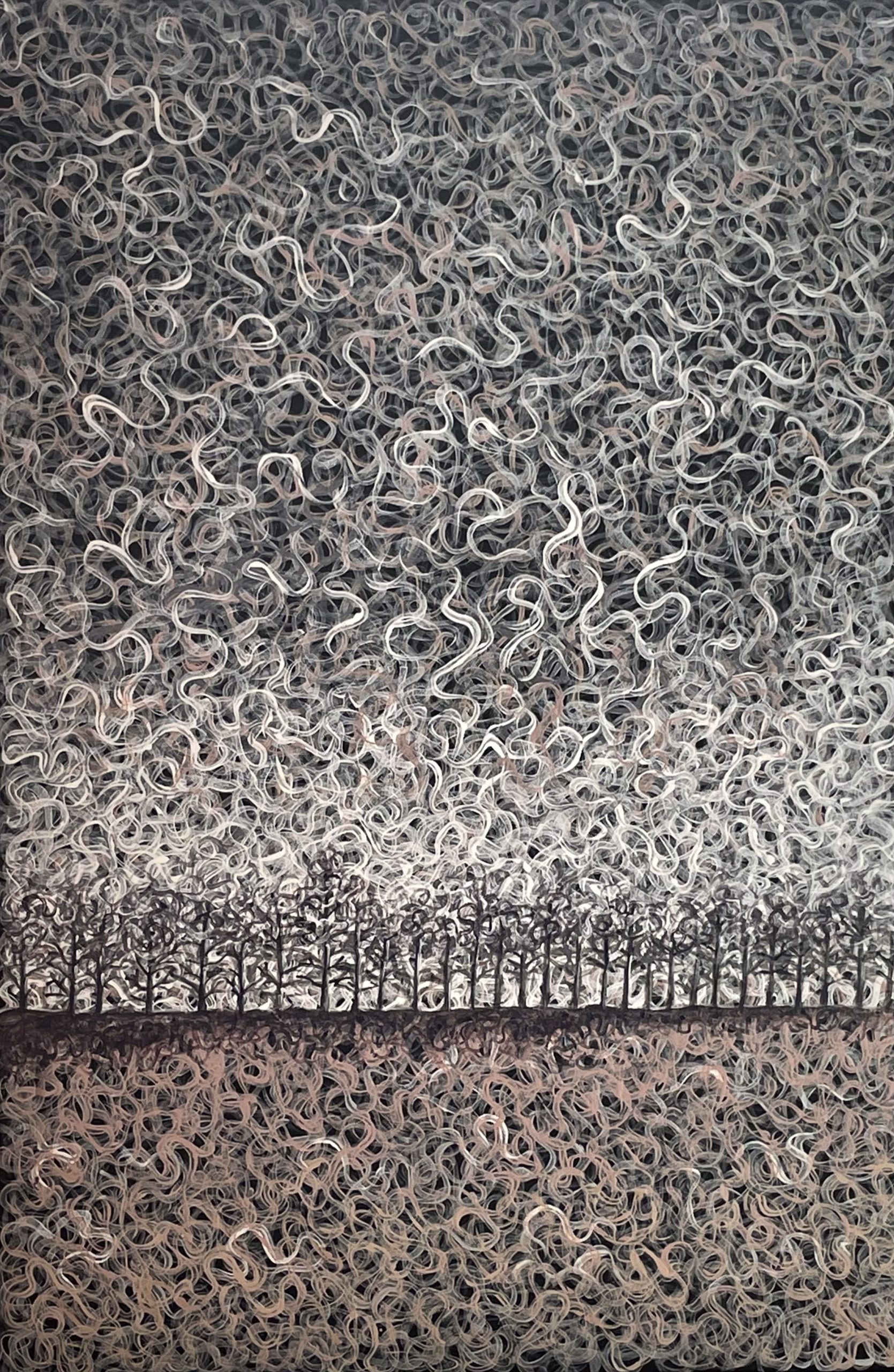 A row of trees with the vast winter sky, the brown ground in the foreground. An abstract landscape. Swirl brushstrokes, layers of colour one on top of the other to create the depth, look closely to see the colours and layers.