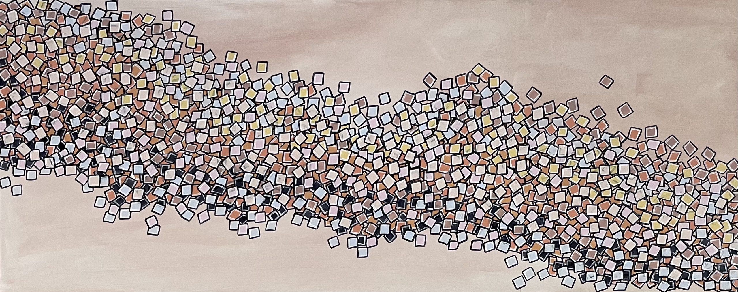 Lots of squares applied, one on top of the other. Waiting for each colour to dry before the next one added. Takes time but I always love the result. Love the look.  The painting can look different depending the distance from which you look at it.  The further away the colours blend and graduate. The closer you are you can see the detail.