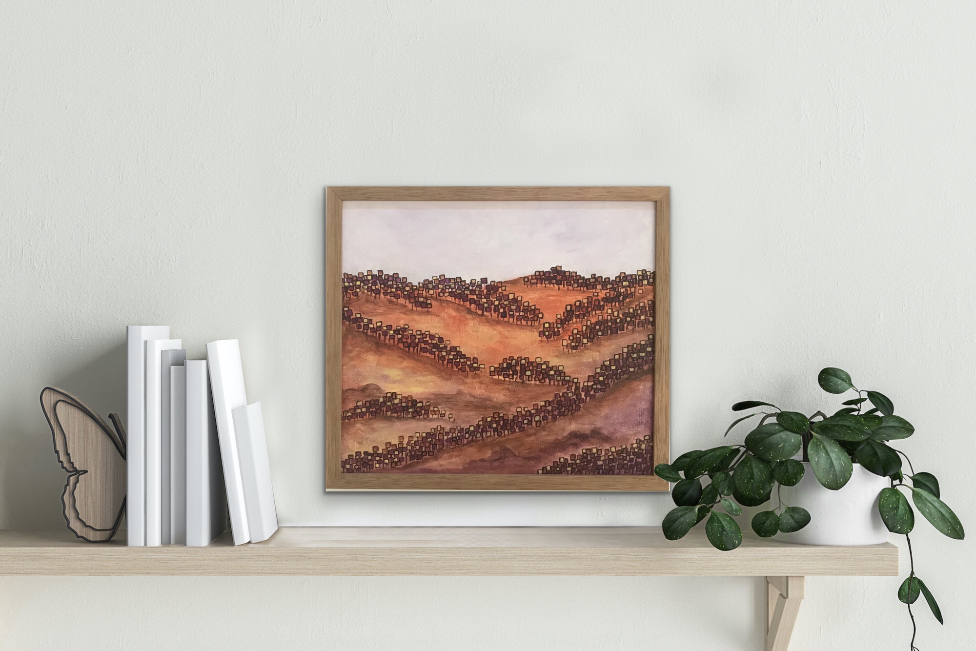 This painting is professionally framed and ready to hang. Framed in a natural oak box frame.