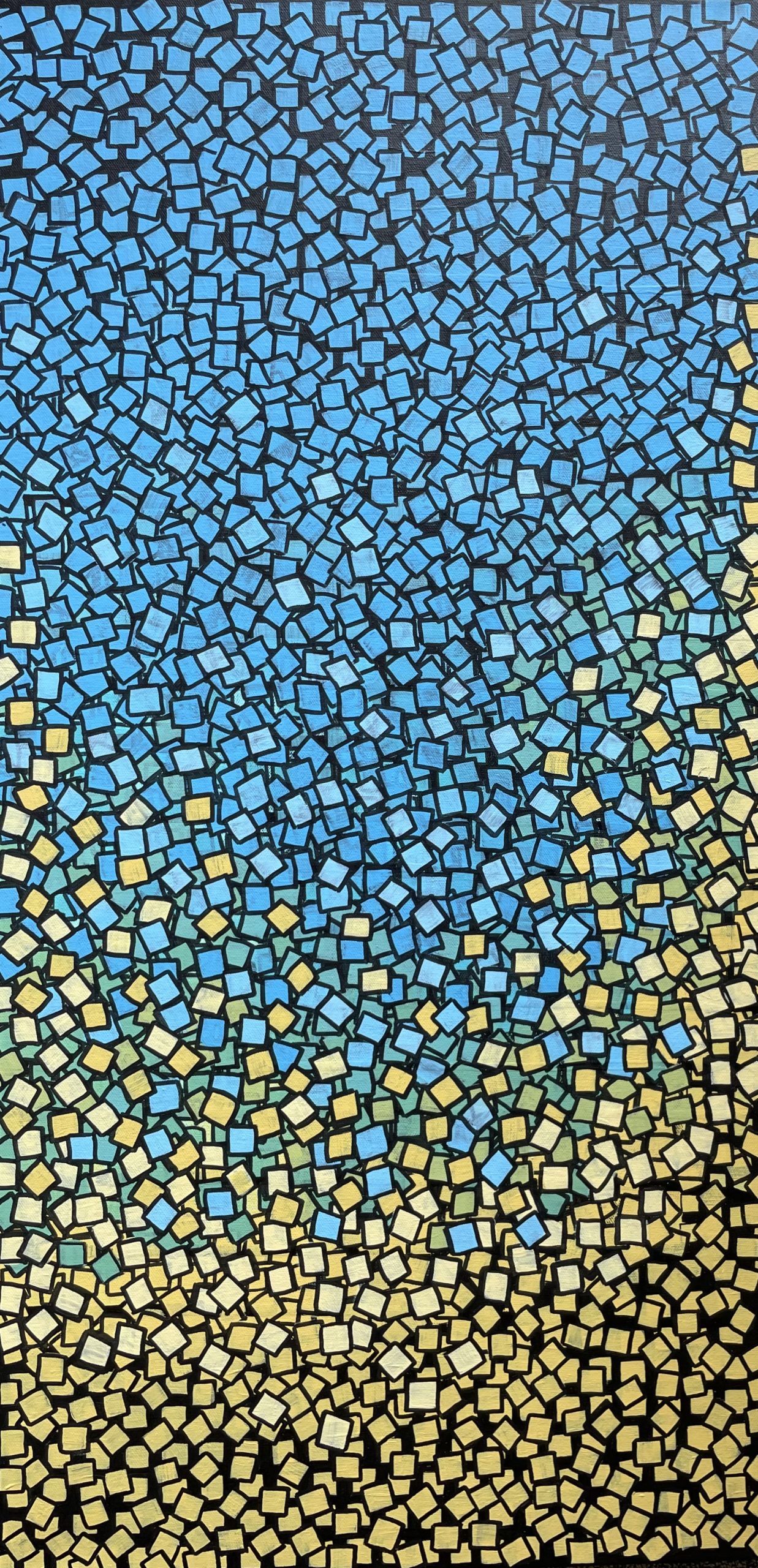 Different shades of blue and yellow squares, all outlined in black. The black outlines make the colours pop.