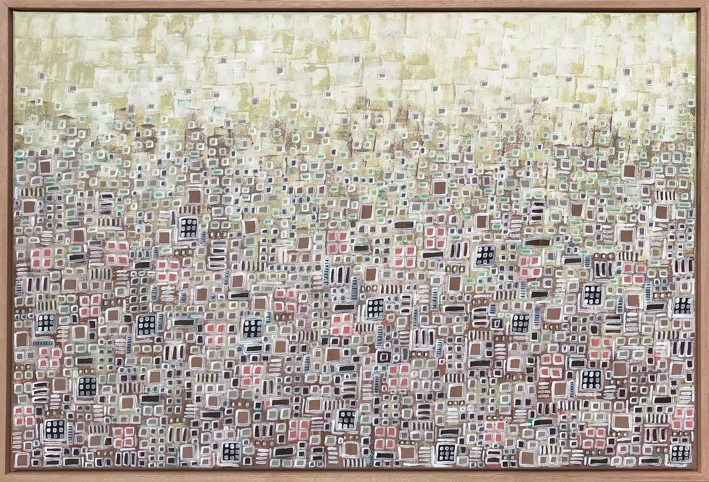 Different painting techniques used to create this unique artwork. Adds texture and interest to the painting. Earthy tones, shades of green, brown and tans. Different shapes, squares and rectangles outlined in white. Love how this artwork evolved and how it turned out.