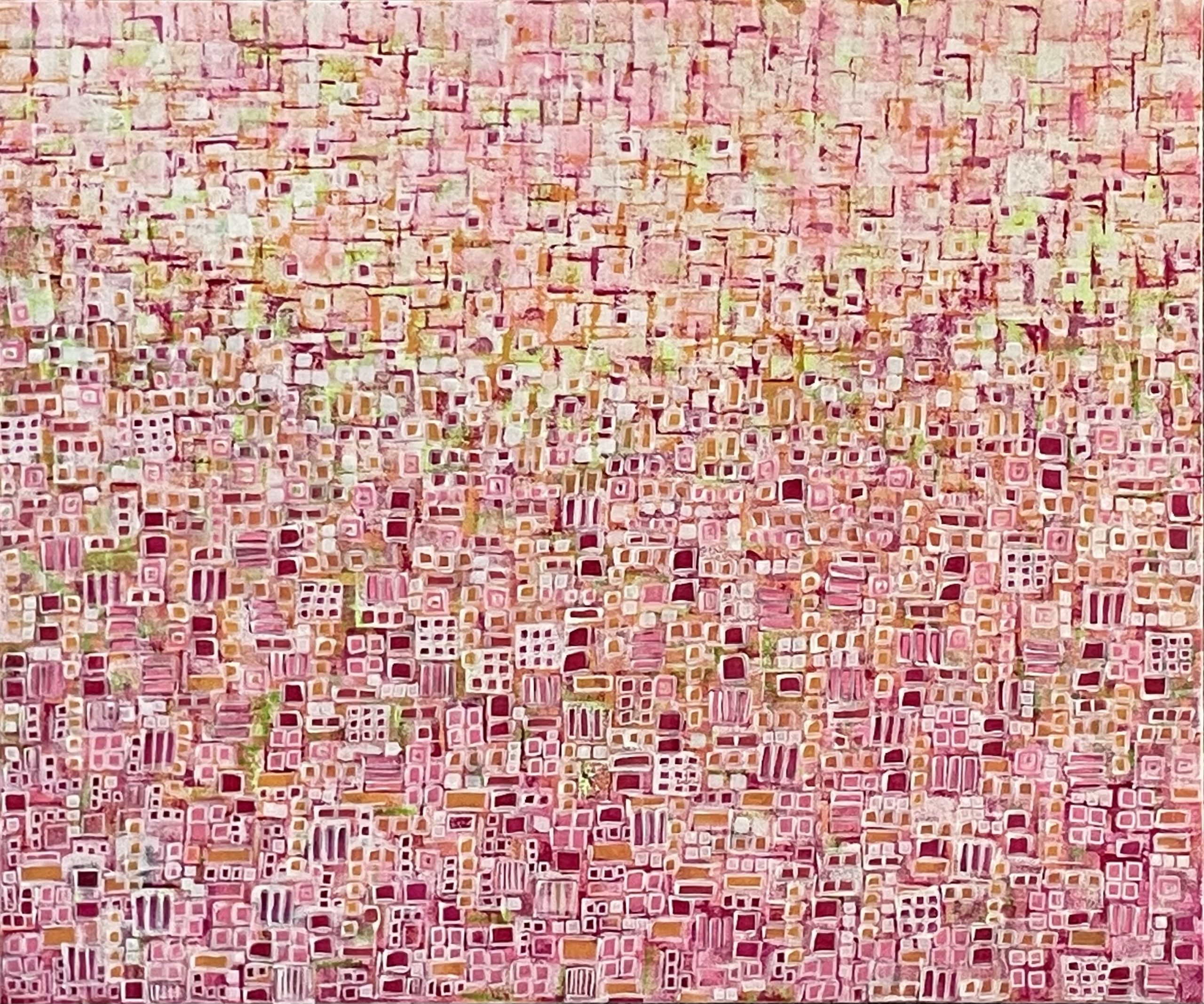 Different painting techniques used to create this unique artwork. Adds texture and interest to the painting. Pinks, oranges, Magenta and a hint of bright green. Different shapes, squares and rectangles outlined in white. Love how this artwork evolved and how it turned out.