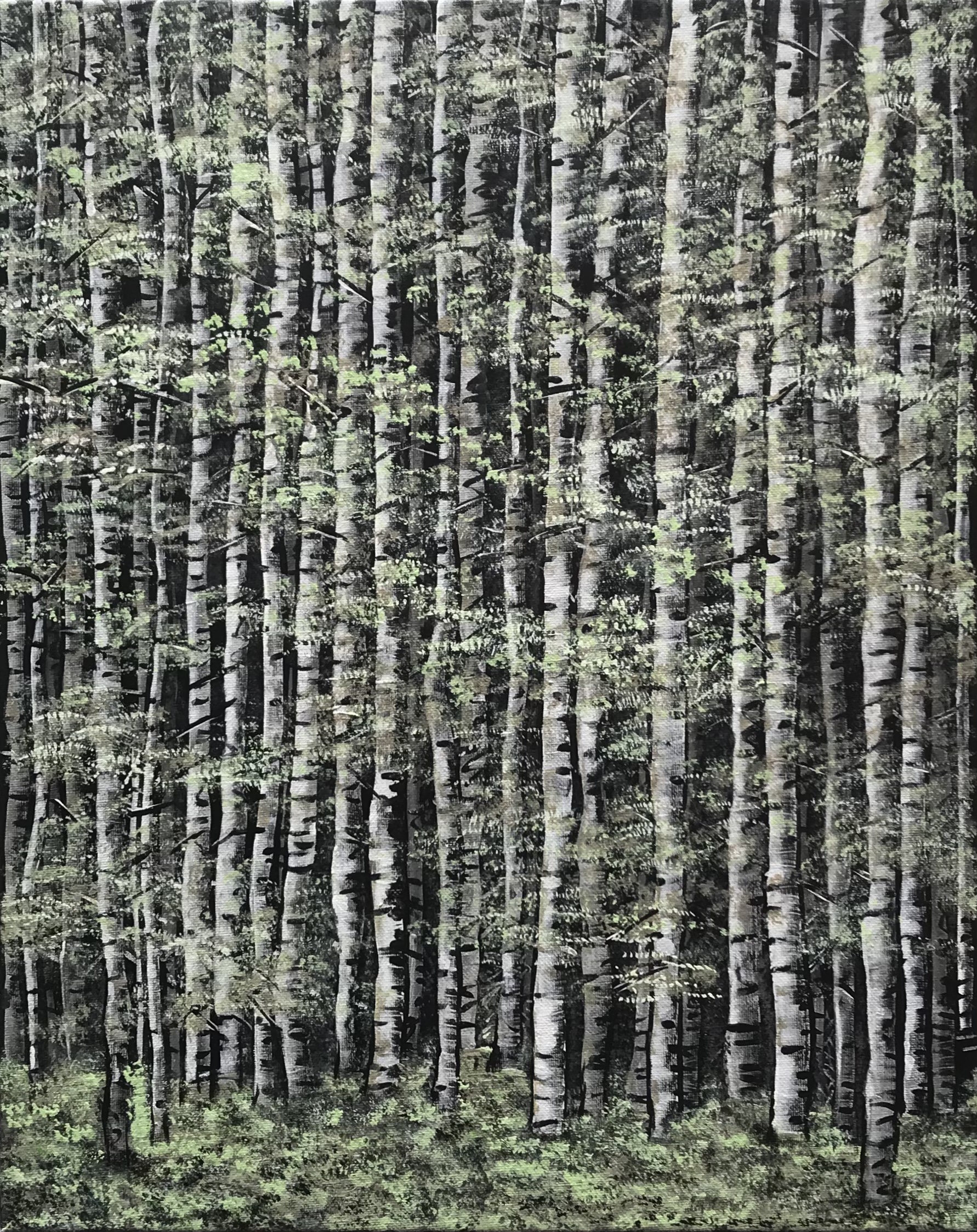 This lovely small/medium landscape of Birch Tree with soft green leaves. Dense forest and the beautiful forest floor below.