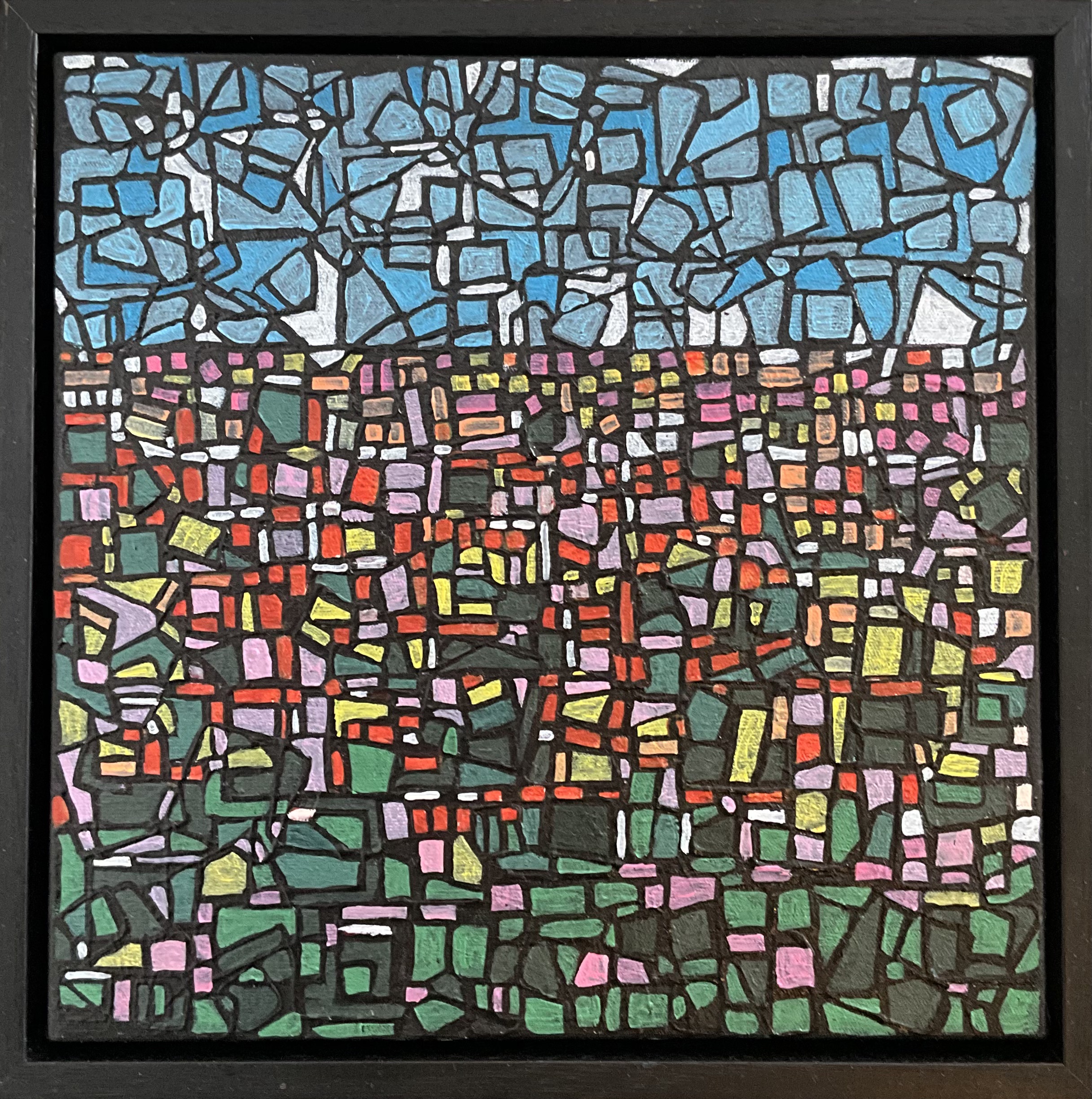 Beautiful abstract landscape. Field of flowers. Layers of square outline shapes as the base and then coloured in. A unique artwork.