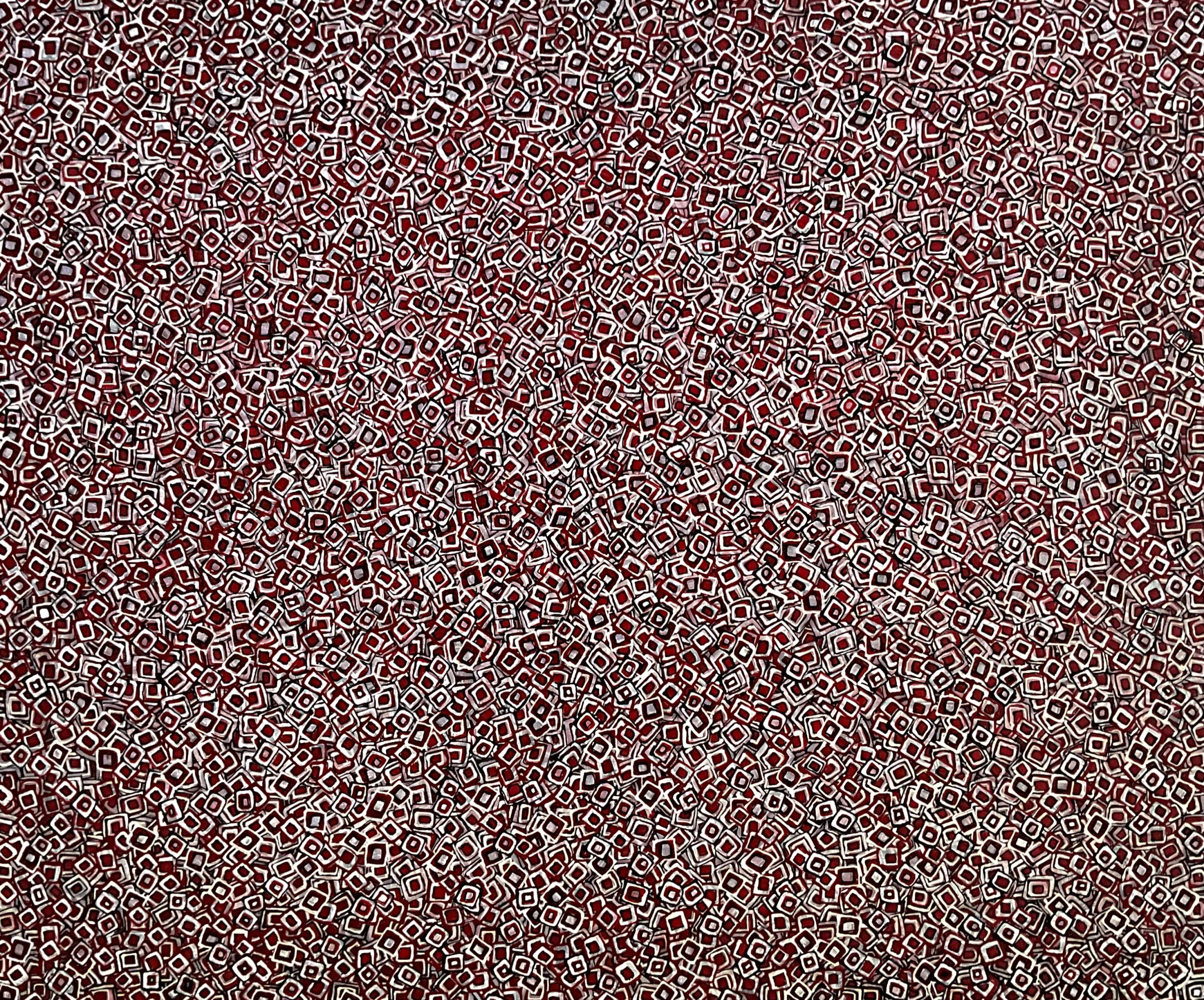 Layers of colour painted onto the canvas. Lots of squares applied, one on top of the other. Every individual square is outlined. Layers upon layers to add texture. Waiting for each colour to dry before the next one added. Takes time but I always love the result. Lots of individual squares.