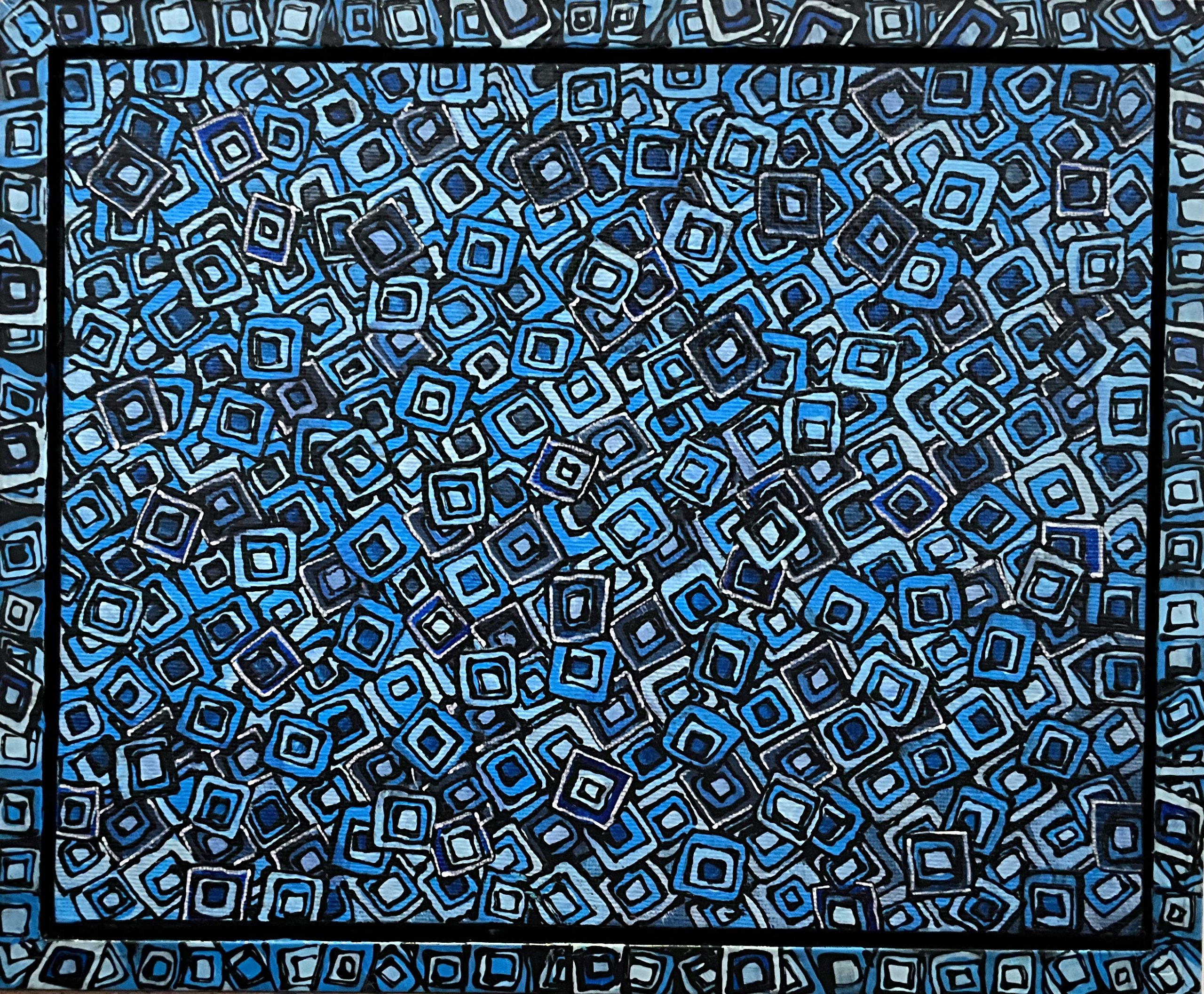 Abstract painting using squares, layer upon layer of squares and colour to create depth. Each square outlined. Â This artwork has an external black frame with the pattern included on the frame.