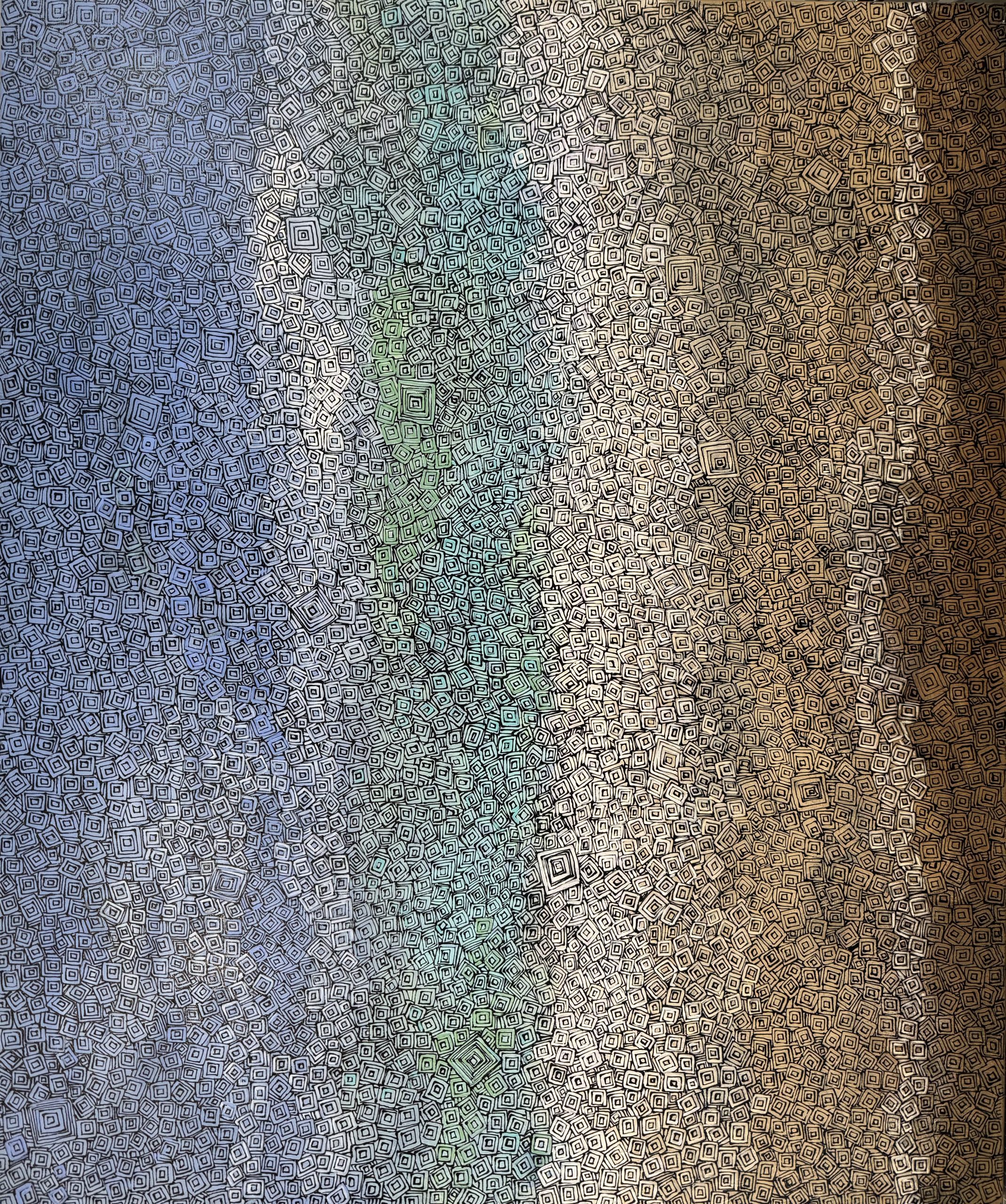 Square patterns on top of each other. The black on top of the lovely shades of green, blue, tan and brown. Layer upon layer of squares and colour to create depth.