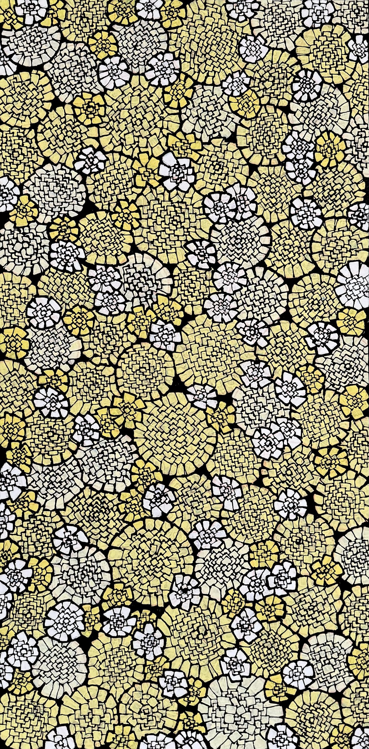 Abstract painting using squares, layer upon layer of squares and colour to create depth. Patterns and shapes, lots of abstract flowers.